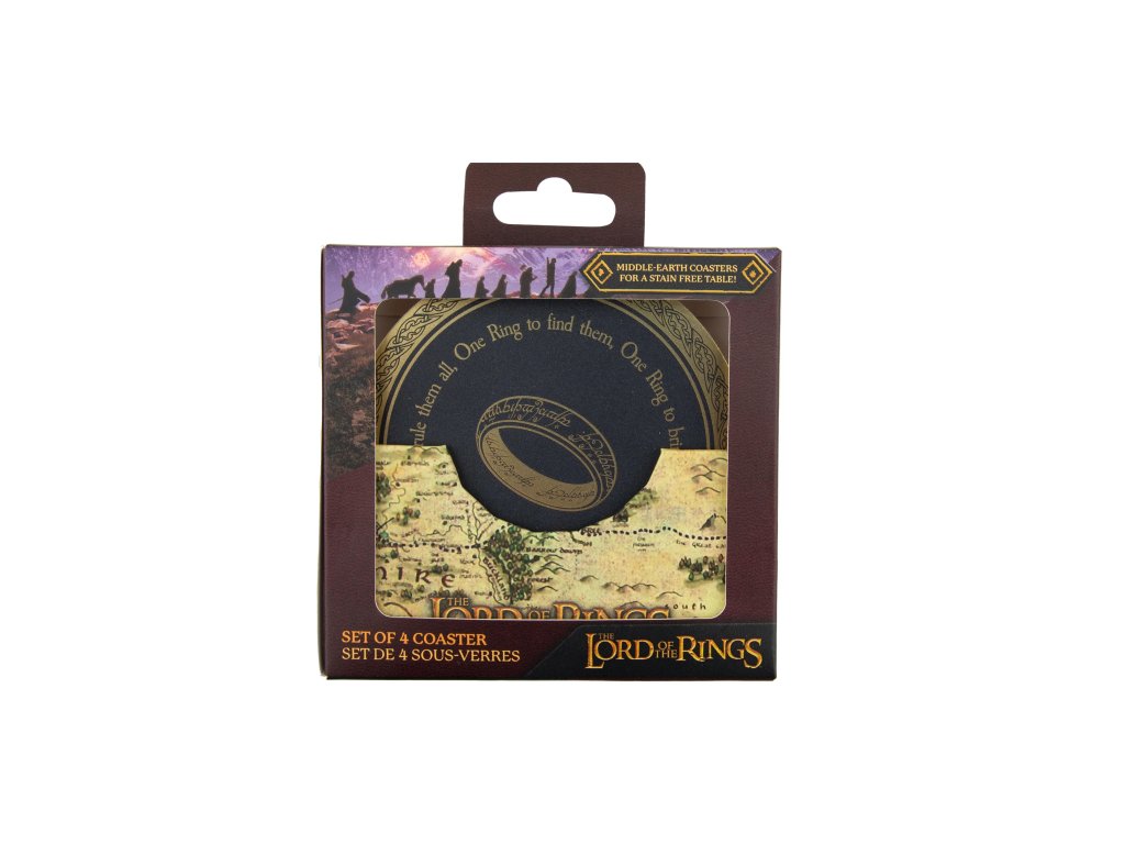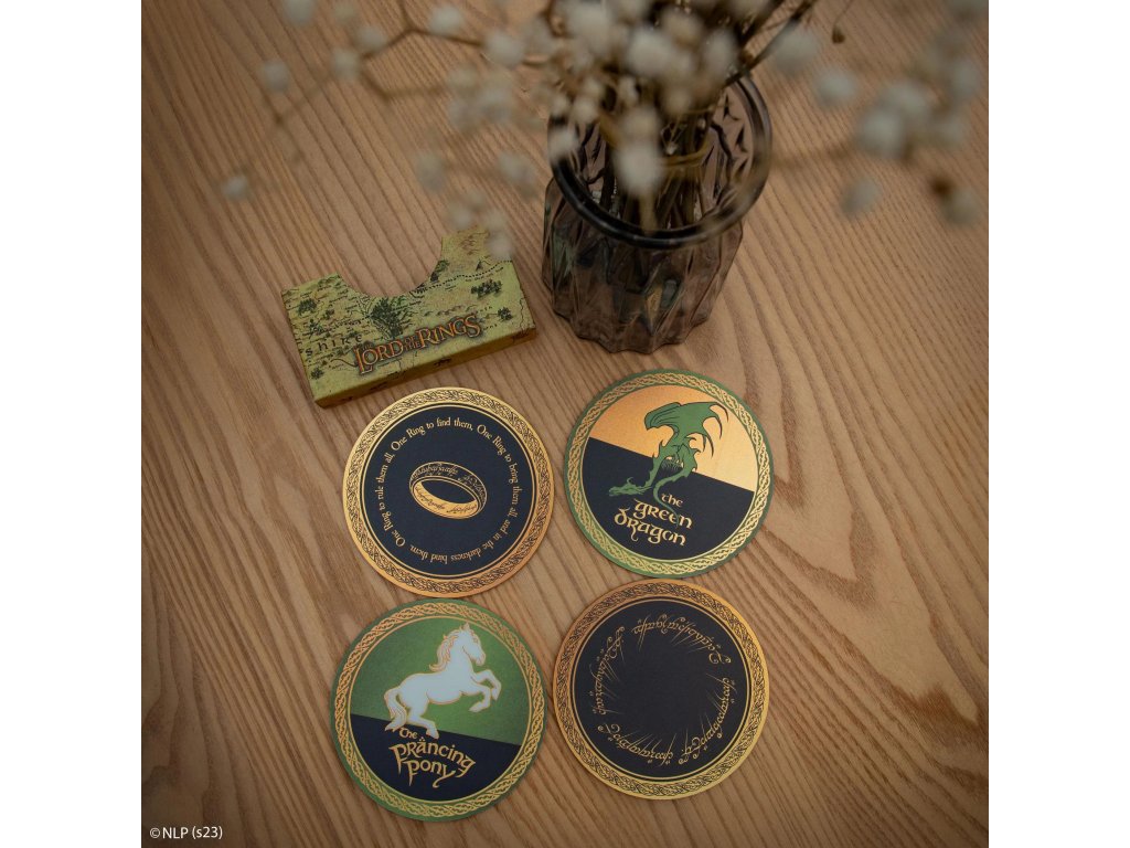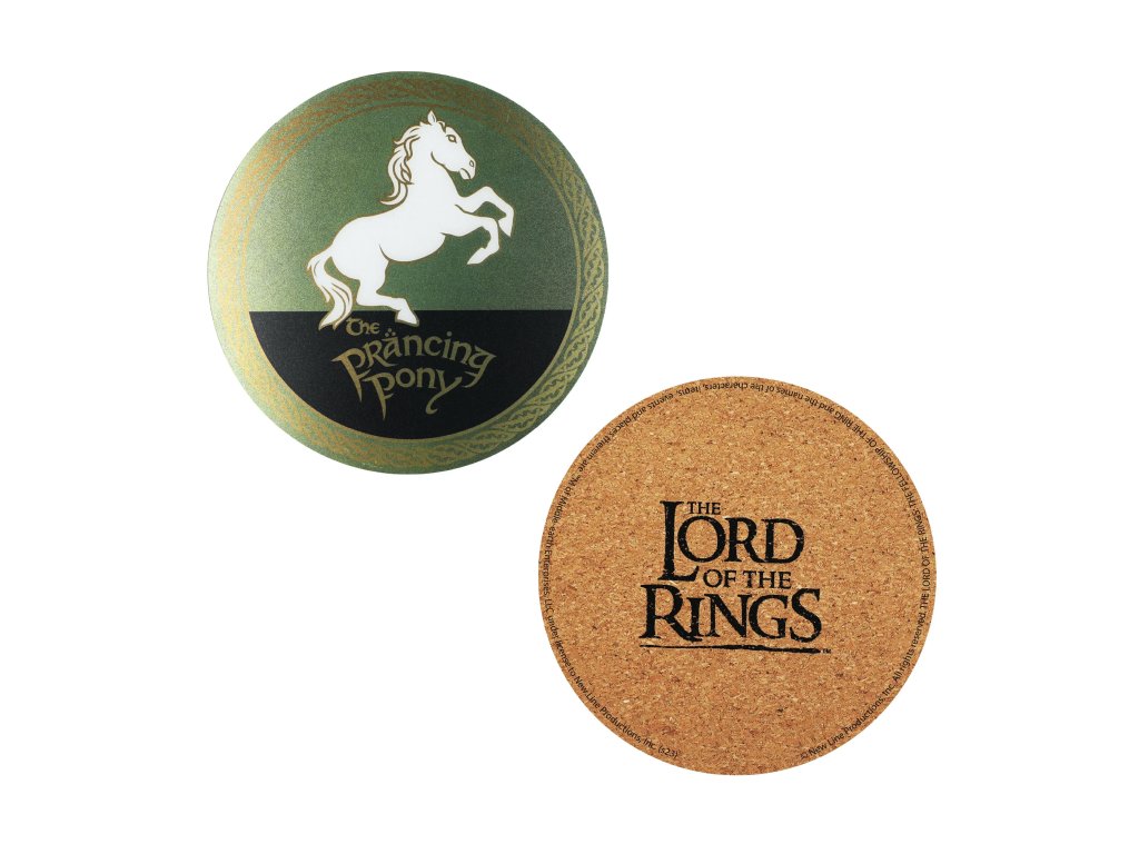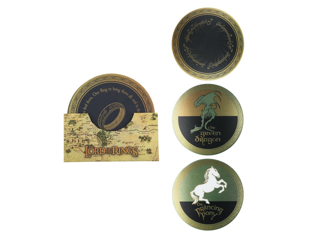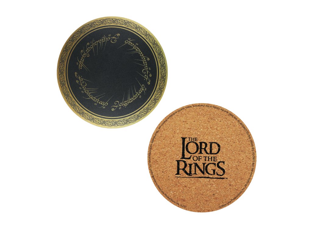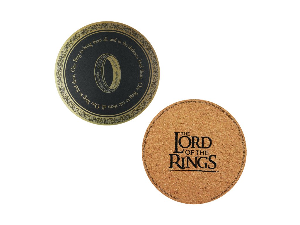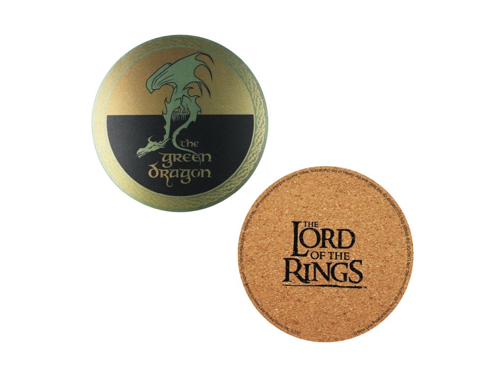 Čtyři korkové podtácky pro milovníky příběhů ze Středozemě. Podtácky zdobí metalické motivy z fantasy filmů Pán prstenů a Hobit, najdete na nich Jeden prsten a hostince U Skákavého poníka a U Zeleného draka.