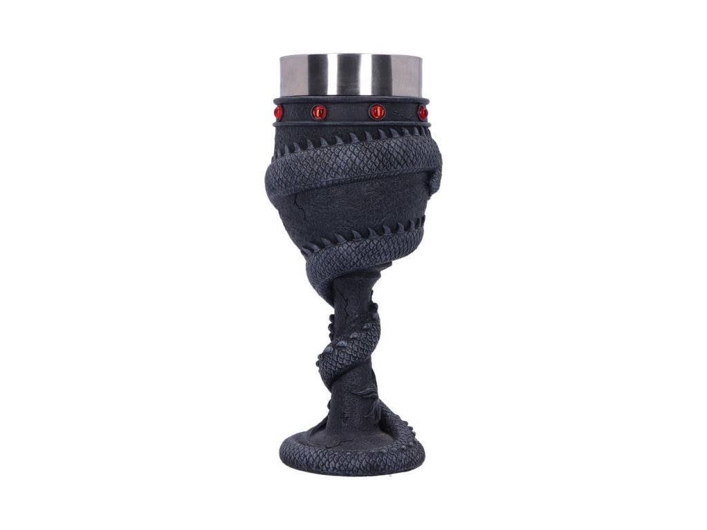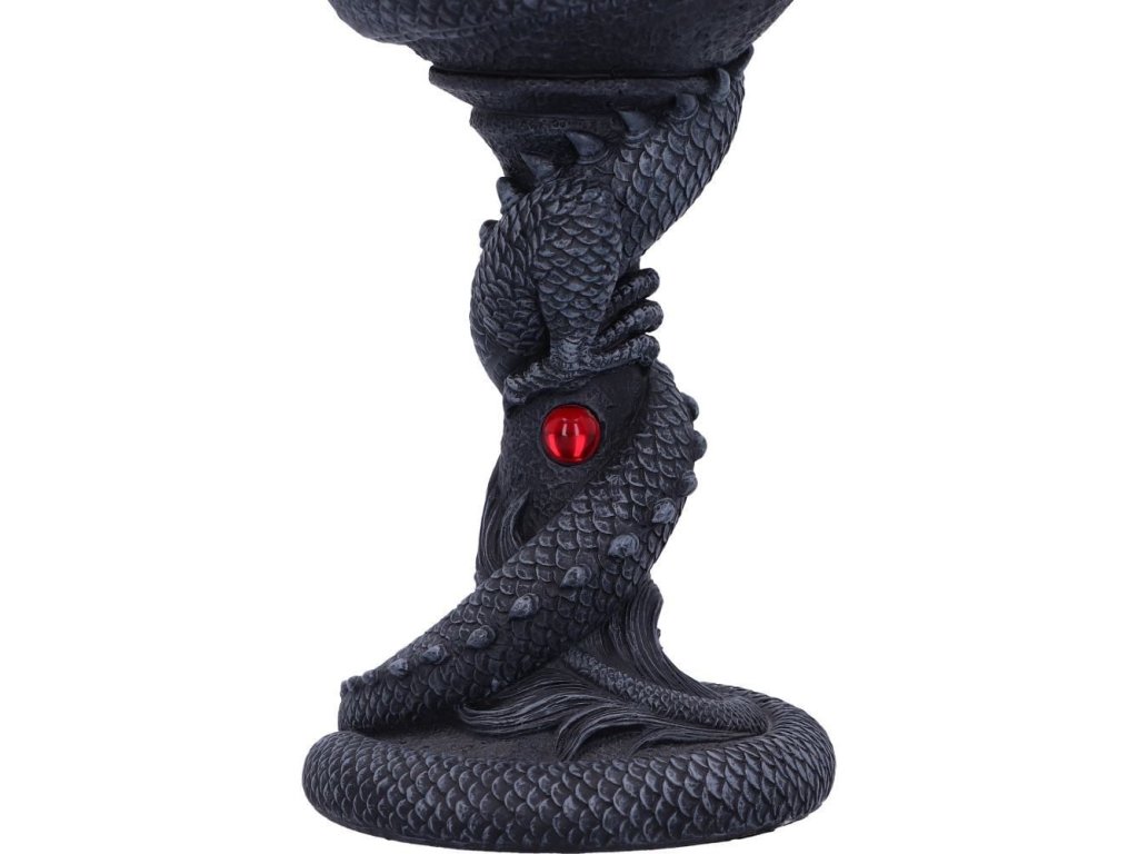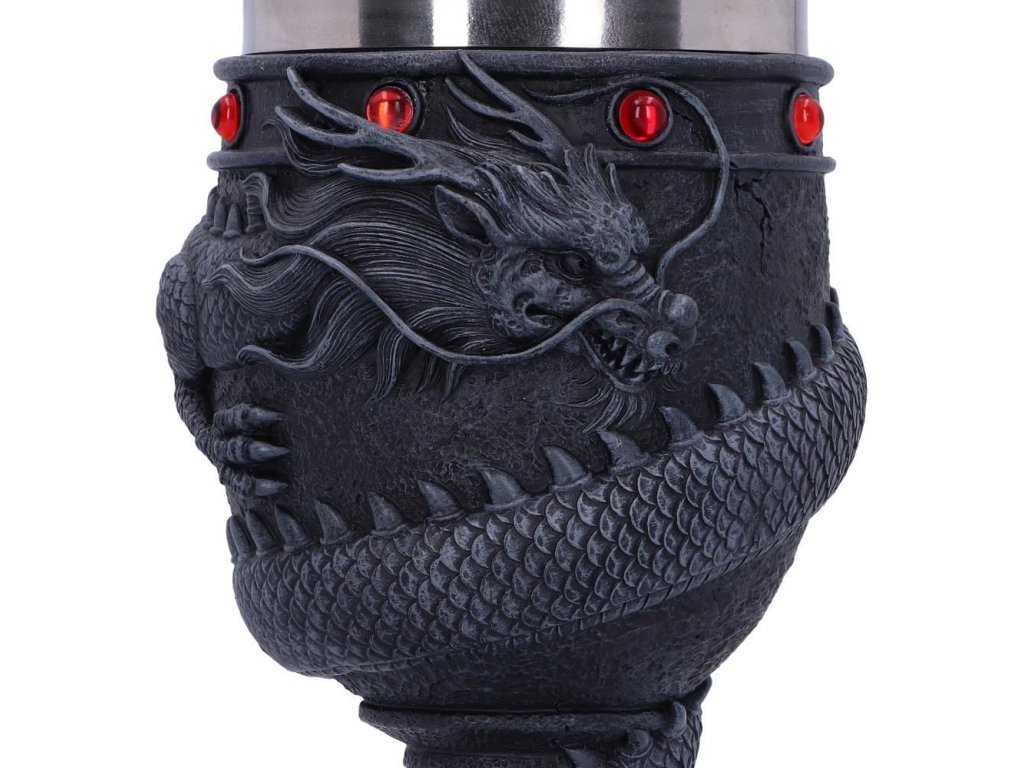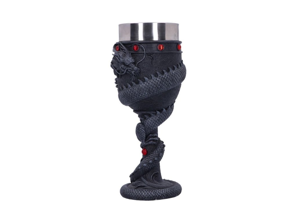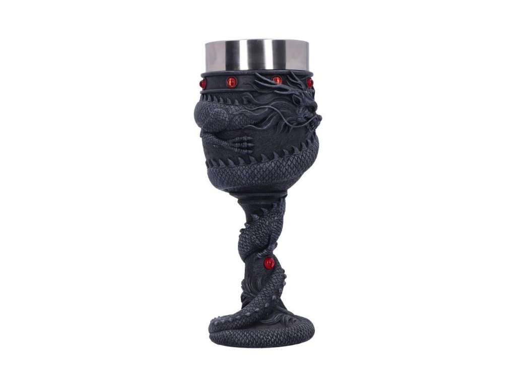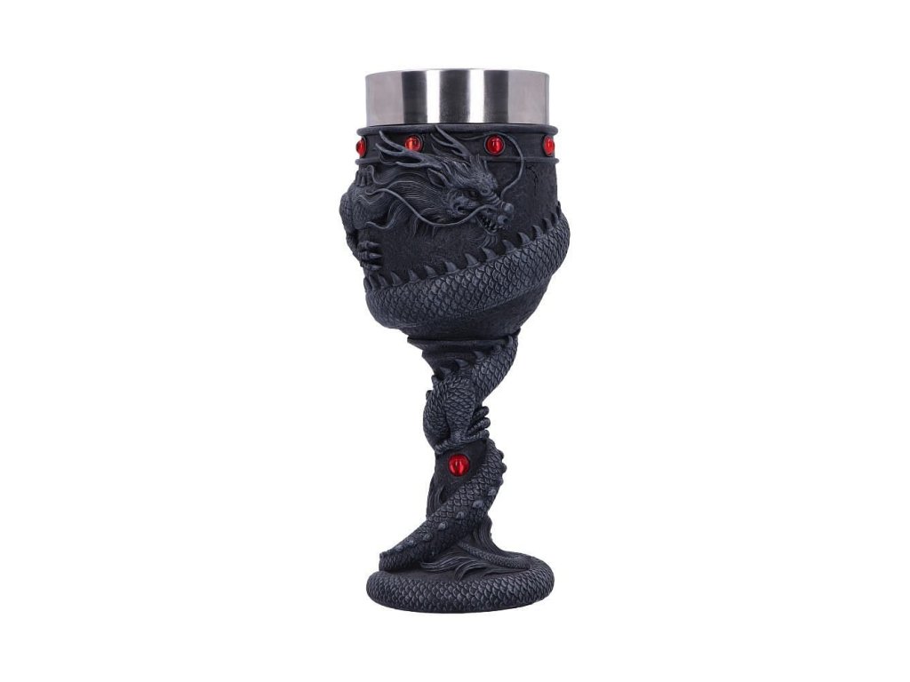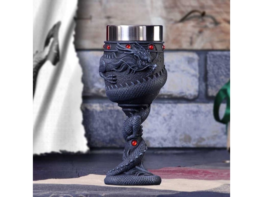 Připijte si z krásného černého poháru, který ovíjí černý čínský drak, žárlivě střežící své poklady! Pohár pro milovníky draků, fantastiky a mystiky bude jedinečným dárkem a skvělým doplňkem domácnosti a bude vám z něj chutnat vaše oblíbené víno nebo medovina. Pohár má v sobě vyjímatelný nerezový insert, který se snadno udržuje, vnějšek je pak z resinu (syntetické pryskyřice). Resinový pohár není vhodný do mikrovlnné trouby ani myčky nádobí.