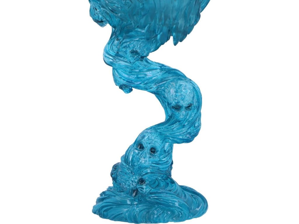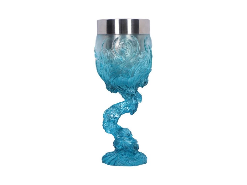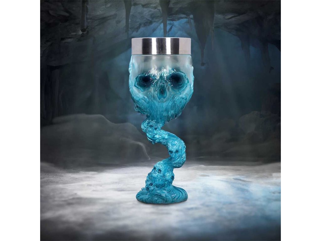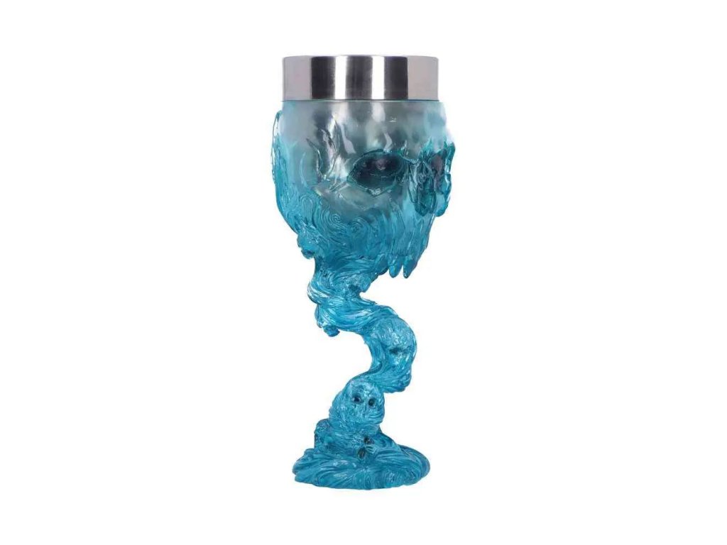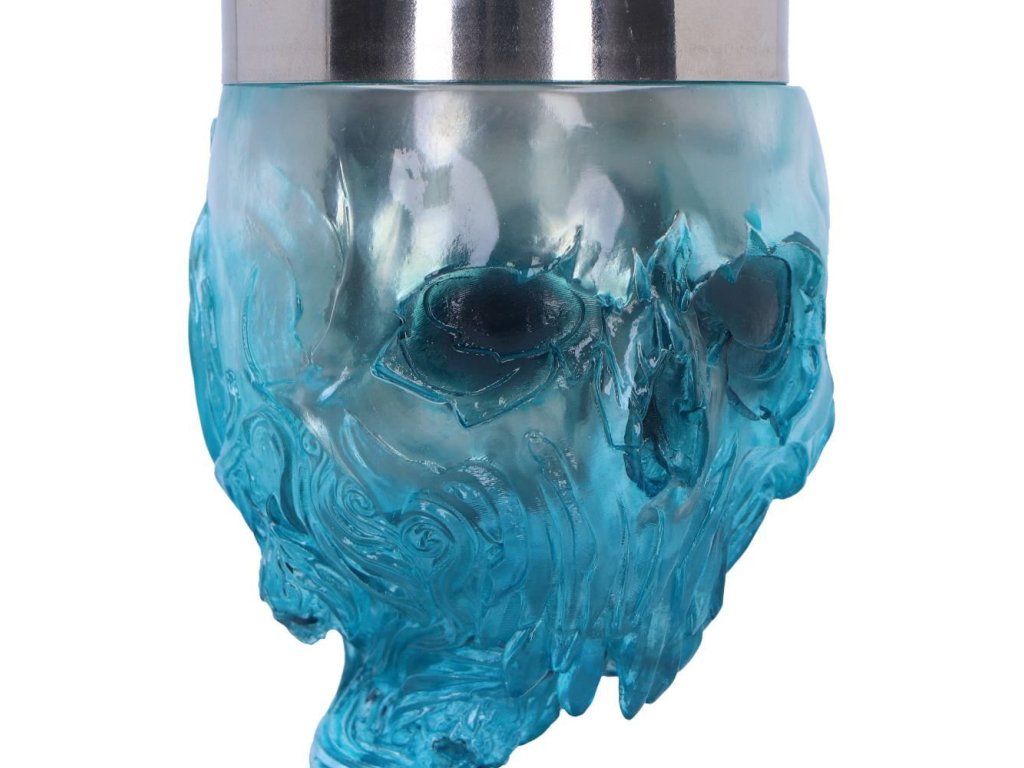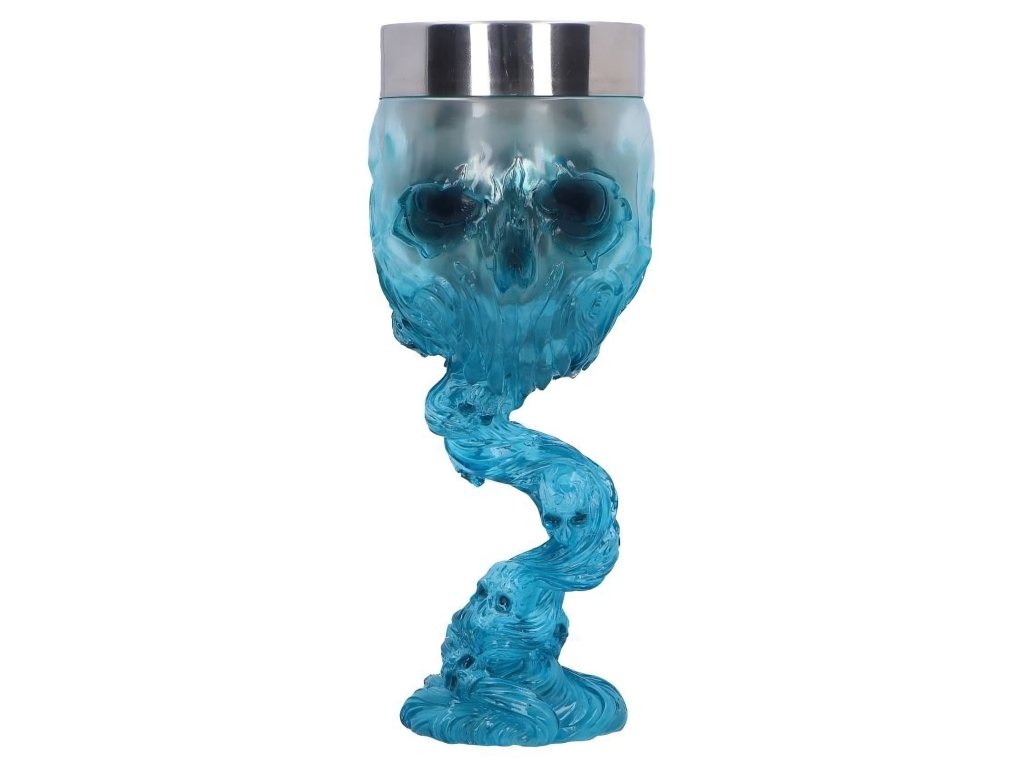 S tímto modrým pohárem budeš vyzván k tanci s dušemi (ne)mrtvých, jejichž lebky jsou ústředním tématem temného fantasy designu. Vířící duchové se spirálovitě stáčejí a vytvářejí tak stopku poháru, kalichem je zubatá lebka. Celé dílo působí jako vytesané z ledu, ve kterém již tisíce let vyčkávají duše nemrtvých na příležitost k pomstě či vykoupení. Tento kousek potěší jak fanoušky fantasy licencí jako Hra o trůny či Dungeons and Dragons, ale také všechny milovníky magie a sběratele lebek či jiných temných mystických předmětů. Uvnitř poháru se nachází vyjímatelná nerezová vložka pro snadnější údržbu, samotný pohár je z resinu (syntetická pryskyřice). Upozornění: výrobek je ručně malovaný a každý kus se může drobně lišit. Resinová část není vhodná do mikrovlnné trouby ani myčky nádobí.