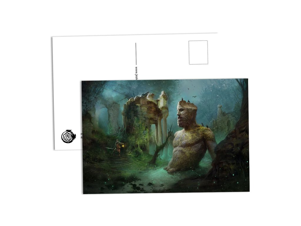 Procházíte temný les, bažinu a konečně ji vidíte. Tajemná ztracená svatyně, ve které na vás čeká něco, co rozhodne o osudu světa. Nejvyšší čas poslat domů pohled! Klasická pohlednice s motivem z RPG Jeskyně a draci.