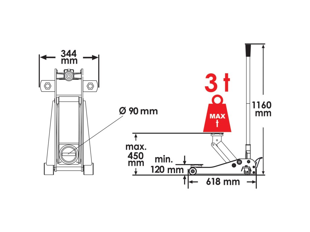 Tento hever má rozsah zdvihu od 120 mm do 450 mm a nosnost 3 tuny.