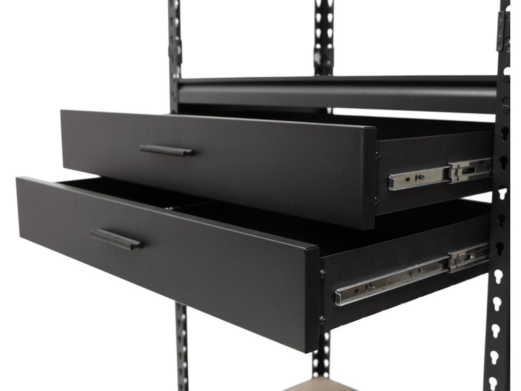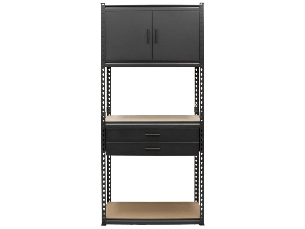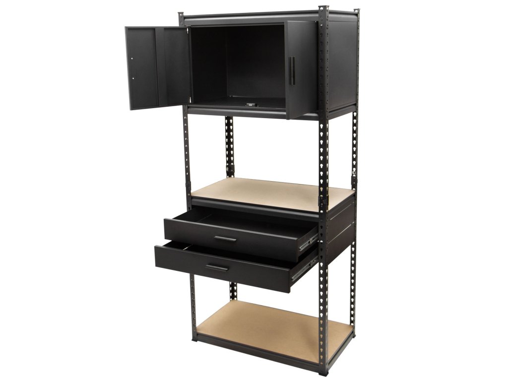 Policový regál s horní skříňkou a 2 zásuvkami, 2 otevřené MDF police. Rozměr 815 x 465 x 1825 mm, nosnost 600 kg. Perforovaná konstrukce pro snadnou montáž. Vhodné pro kombinaci s dalšími regály.