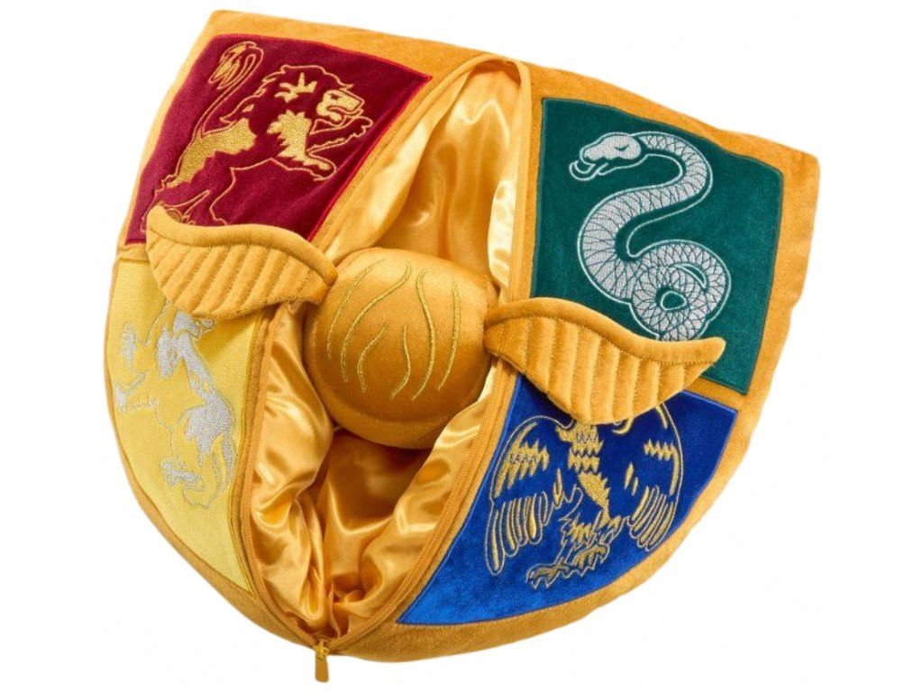 Měkký barevný polštář v podobě erbu bradavické školy čar a kouzel z Harryho Pottera bude chloubou tvého křesla i pohovky. Návíc k němu dostaneš i ideálního společníka v podobě plyšové famfrpálové Zlatonky! Polštář má přes celou svou délku zip, díky kterému si bezpečně schováš Zlatonku i jiné svoje poklady.