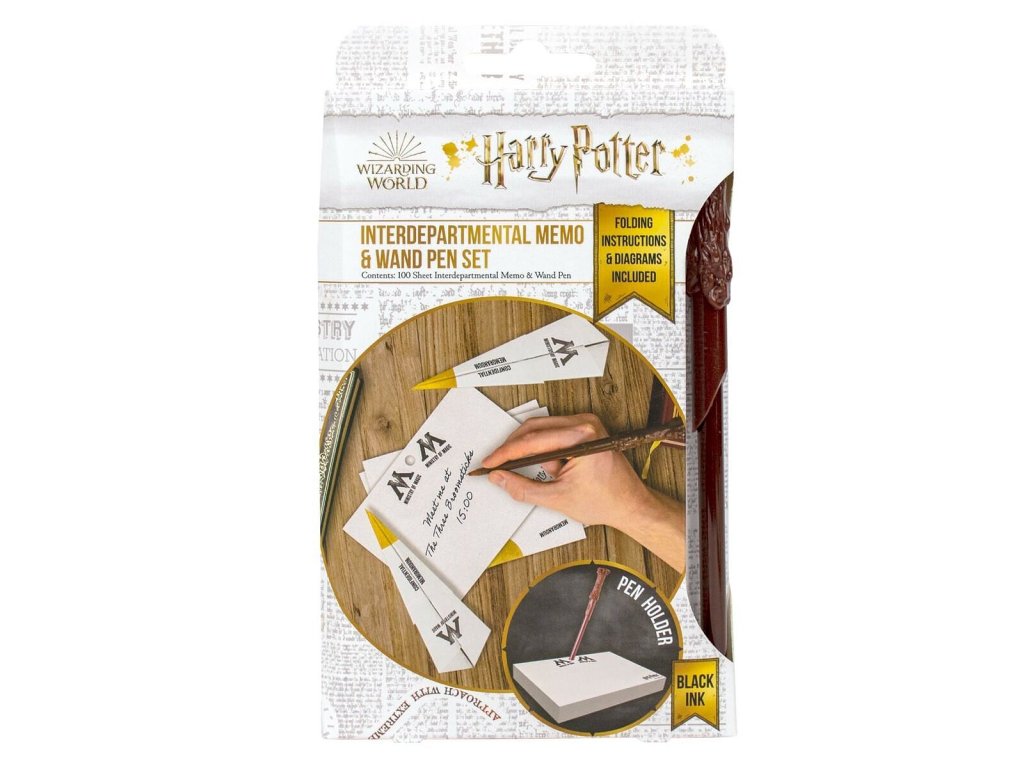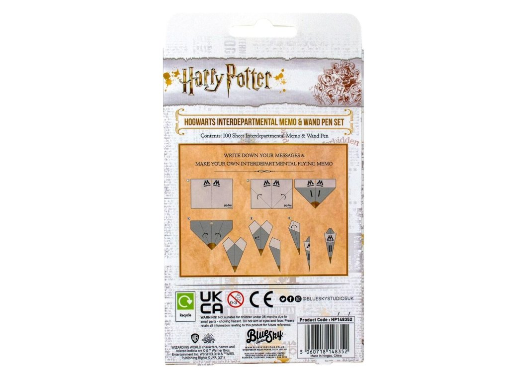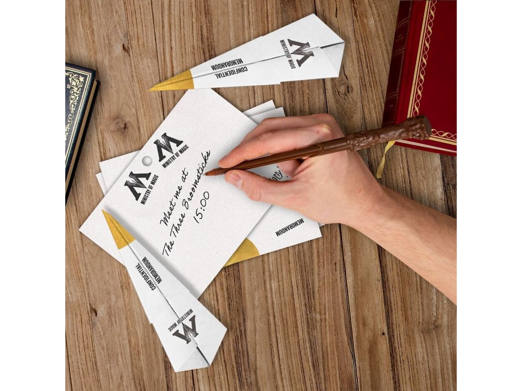 Originální poznámková sada pro fanoušky Harry Pottera obsahuje sadu poznámkových lístků a propisku v podobě kouzelnické hůlky (s černým inkoustem). List s poznámou můžete složit podle návodu do vlaštovky a poslat do vedlejšího oddělení na ministerstvu kouzel. Bloček slouží také jako stojan na propisku.