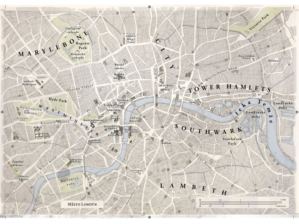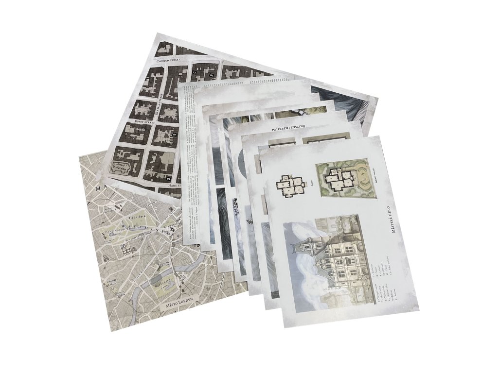 Sada barevně vytištěných map na křídovém papíře. Součástí je 7 připravených lokací ve formátu A4 a 2 podrobné mapy Londýna a jeho části (A3) s podrobným popisem.