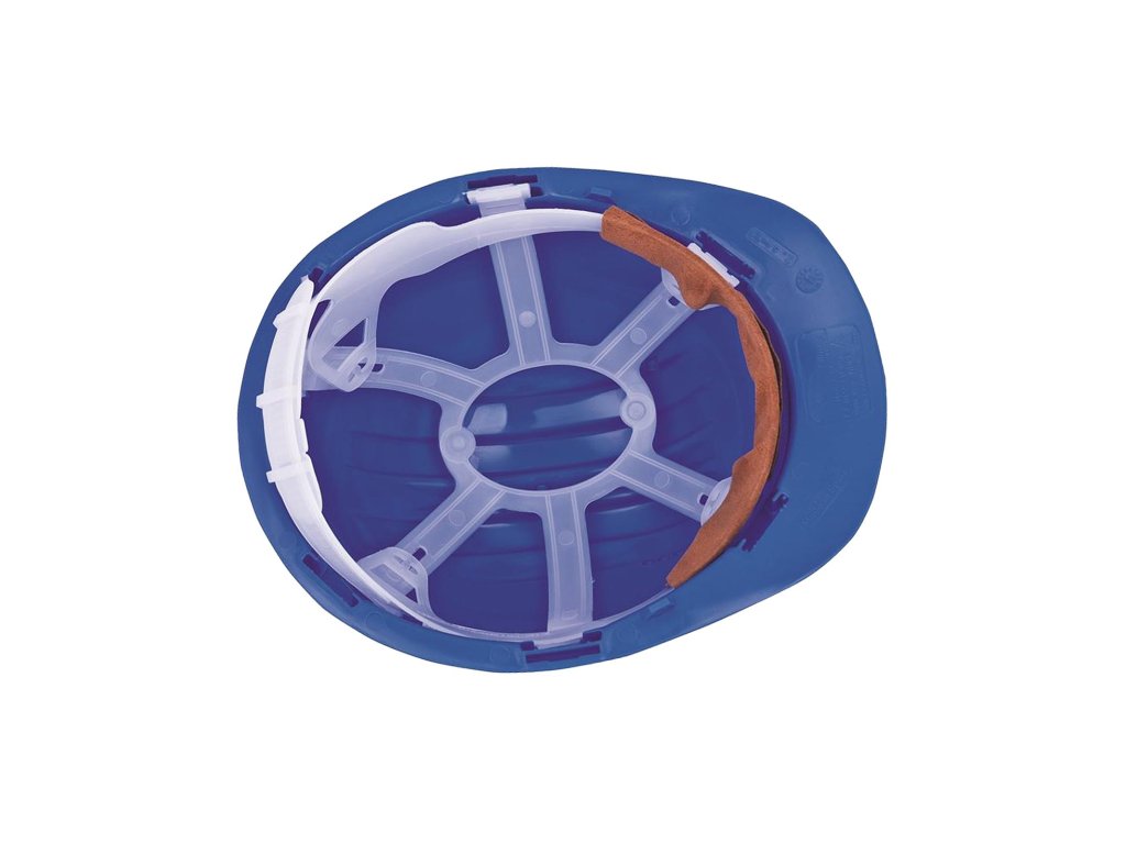 Lehká polyetylénová fasetová skořepina (přilba) s prodloužením nad zátylkem, zavěšená ve čtyřech bodech na textilních páscích