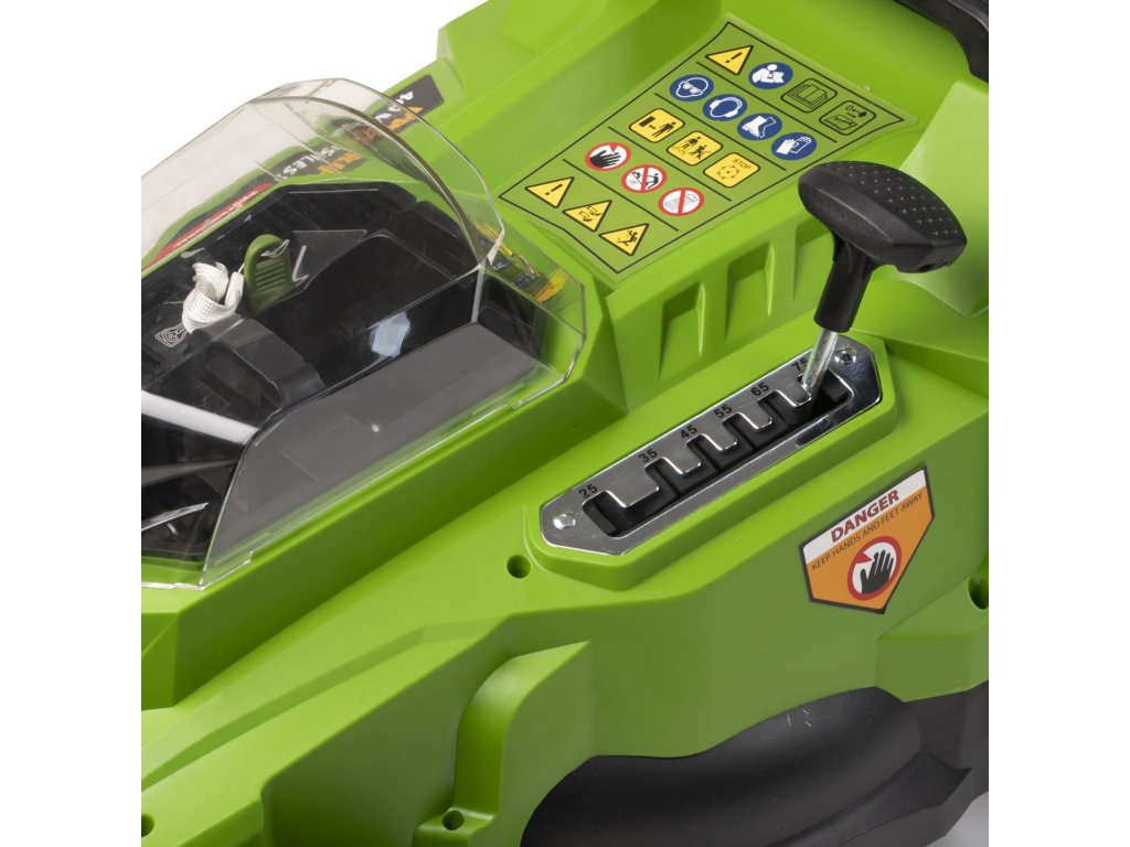 - Otáčky: 3300/min, výška sekání: 25–75 mm.