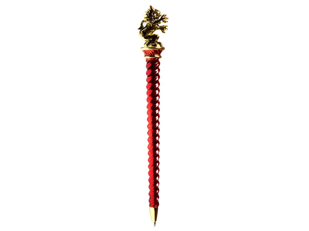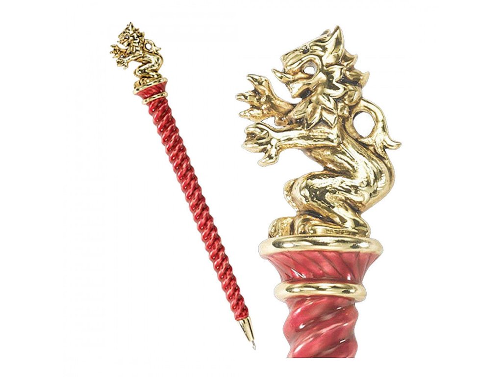 Začněte si zapisovat poznámky a magické formule s krásnou červenou kouzelnickou propiskou v podobě hole zakončené lvem, v Harrym Potterovi charakteristickým erbovním zvířetem bradavických kolejí Nebelvír (Gryffindor). Kovová propiska je bohatě smaltovaná, oba konce propisky jsou pozlacené a na vašem stole bude působit jako nepřehlédnutelný šperk. S touto úžasnou propiskou se vaše myšlenky a zápisky samy rozběhnou po kouzelných řádkách, například některého z našich zápisníků.