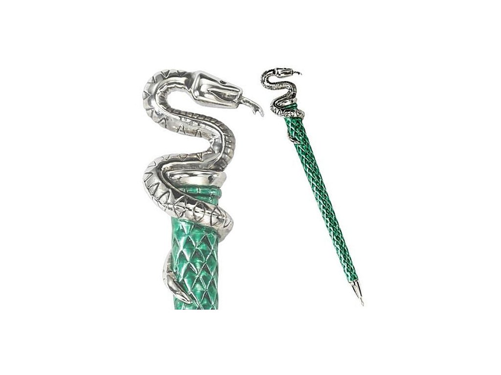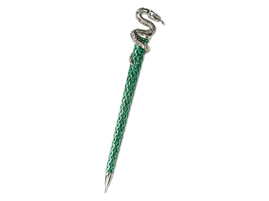 Precizně tvarované, zeleně smaltované kuličkové pero zakončené postříbřenou hlavicí s hadem, neodmyslitelným kolejním zvířetem Zmijozelu v Harry Potterovi. Krásná kovová propiska se vám bude hodit při výuce nejen v Bradavicích! Výborným patronem vašich poznámek se může stát některý z kouzelnických zápisníků. Kdo ví, třeba je věrnou replikou hůlky Vincenta Crabbee, ba samotného Draca Malfoye.