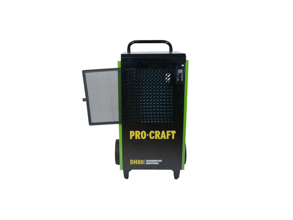 Profesionální vysoušeč vzduchu Procraft DH80 je určen k vysoušení vzduchu obytných prostor i komerčních objektů s podlahovou plochou do 180 m2. Disponuje výkonem až 70 l/den a průtokem vzduchu až 400 m3/h. Časovač umožnuje nastavit délky chodu vysoušeče. Praktická rukojeť a dvě velká pojezdová kola zaručují snadnou přepravu. Plášť z ocelového plechu a odolná konstrukce umožňuje použití i v náročných průmyslových podmínkách. Průmyslový odvlhčovač má možnost výměny prachového filtru. Velkou výhodou je i možnost nepřetržitého odvlhčování pomocí odtokové hadice, která je součástí balení. Balení karton.
