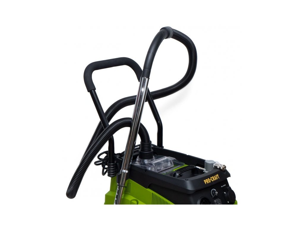 Průmyslový vysavač Procraft VP2000 je určen k mokrému i suchému vysávání. Je možné ho použít na staveništích, dílnách truhlářských a lakovacích provozech, ale i jako domácí vysavač, nebo k vysávání auta. Je vhodný pro odstraňování třísek, pilin a sádrového prachu. Vysavač má 4 m sací hadici a telekopicky nastavitelnou ocelovou trubku Silný motor s příkonem 1600 W zaručuje vysoký sací výkon o 18kPa a dokáže tak účině vysát prach ze strojů a těžší nečistoty ze stavby. Poradí si s rozlitou vodou, kterou vysává do nádoby (čištění koberců). Plynulou regulace sací síly, manuální oklep prachových filtrů. Rychloupínací spony usnadní výměnu pytlů. Automatický systém zapínání integrovanou zásuvkou 230V včetně funkce doběhu usnadní práci. Vysavač je dobře pojízdným díky kombinaci dvou velkých kol a dvou otočných, vybaven pohodlnou rukojetí pro přenášení. Součástí dodávky je odsávací hadice, hepa filtr, teleskopická kovová trubka, hubice, sáčky a kola. Balení karton.