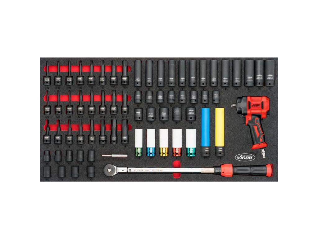 Pěnová vložka o rozměrech (š x h x v) 750 x 393 x 35 mm obsahuje celkem 69 ks profesionálních kovaných nástrčných klíčů různých velikostí, barevně označených nástavců na kola, různé typy bitů (například TORX), včetně samotného rázového utahováku a momentového klíče.