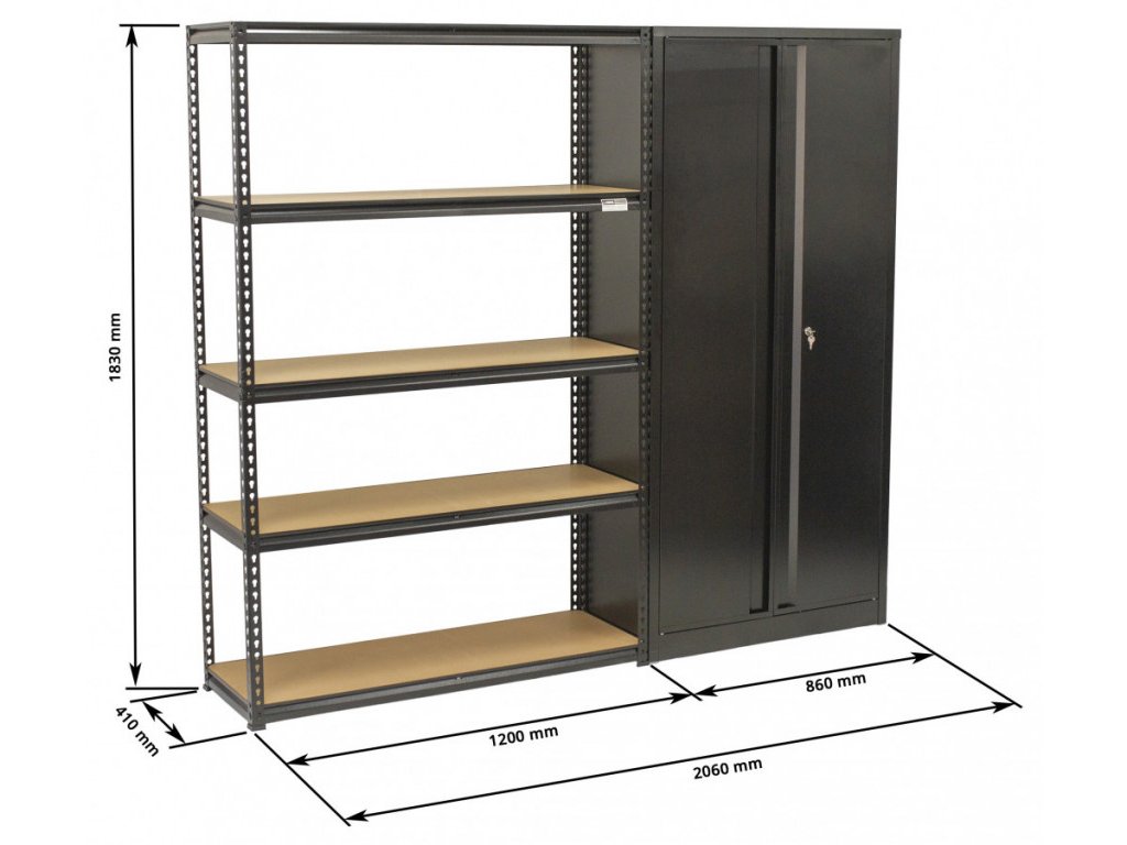 Regálový systém obsahuje klasický rovný regál o šířce 1200 mm a uzamykatelnou dílenskou skříň o šířce 860 mm.
