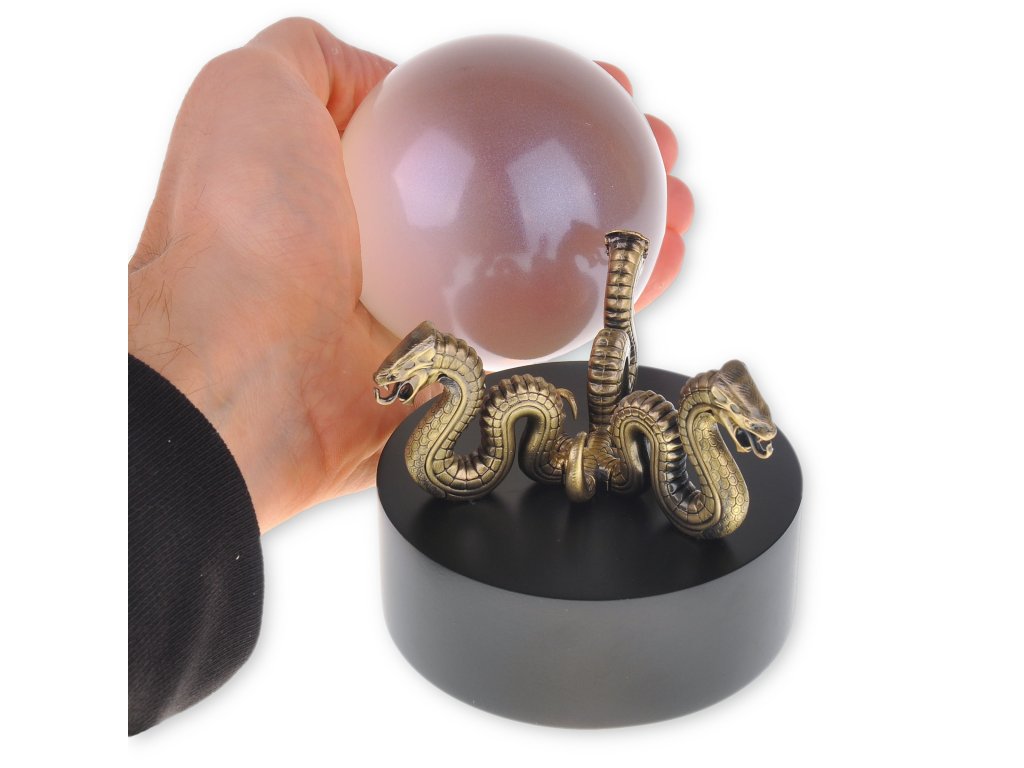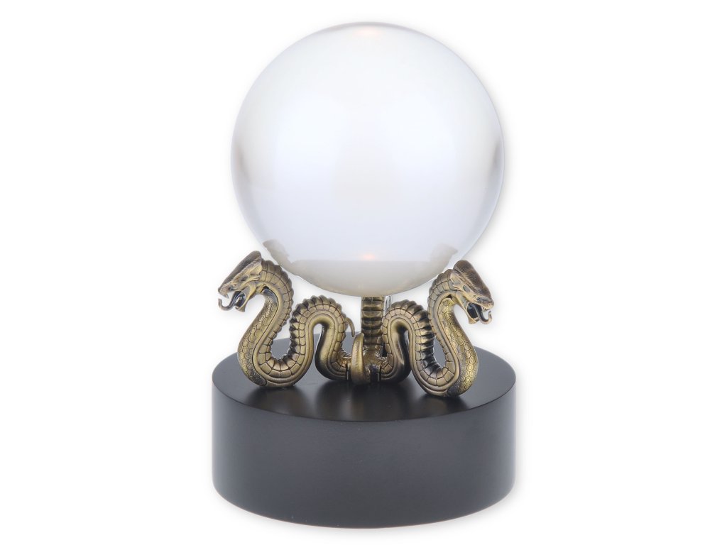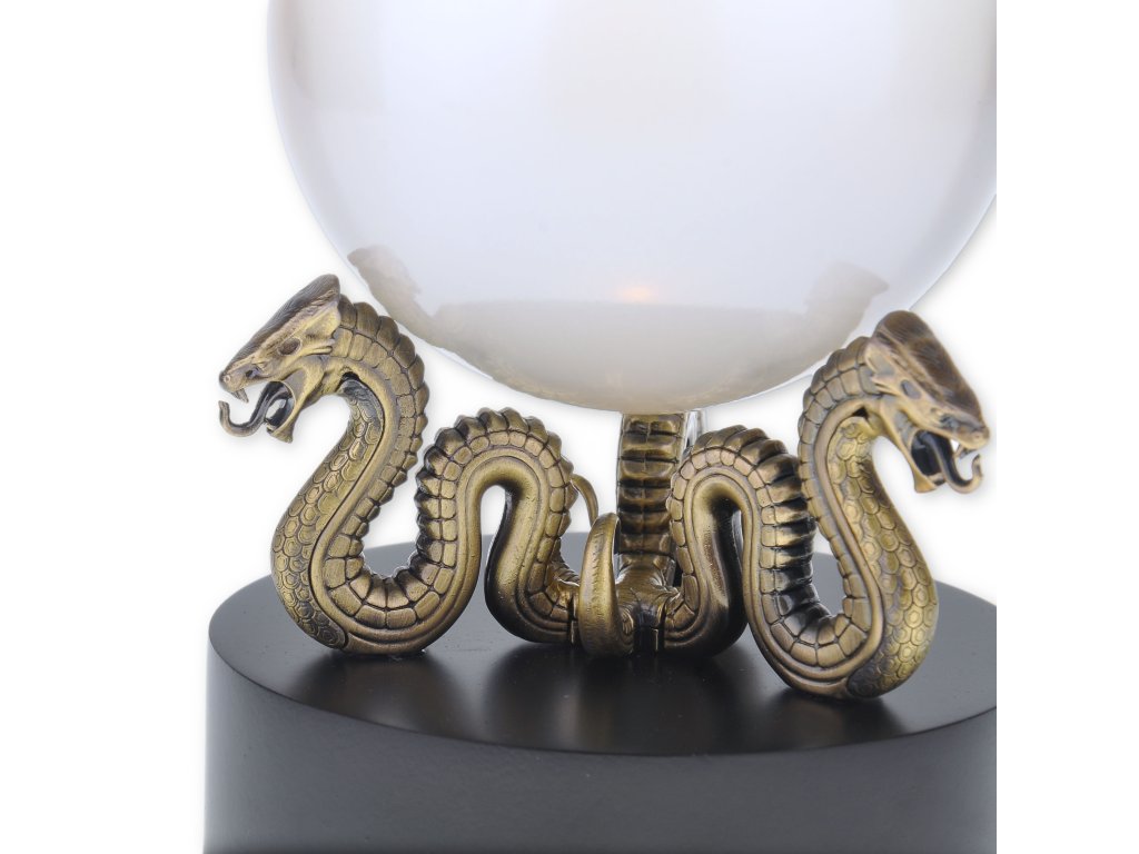 Dokonalá replika křišťálové koule (orakula) patřící profesorce a vědmě Sibyly Trelawneyové, která z ní vyvěštila porážku Lorda Voldemorta v Harrym Potterovi. Předlohu repliky můžeš vidět ve filmu Fénixův řád. Skleněná koule je vsazena mezi 3 bronzové bazilišky. Jaká tajemství a odpovědi nám asi odhalí tato překrásná mysteriózní dekorace? Ukázka Sibyliny křišťálové koule na YouTube od Franta Flinta - Collector and movie fan.