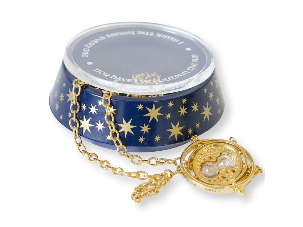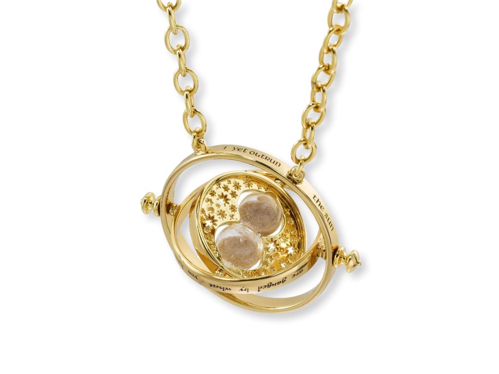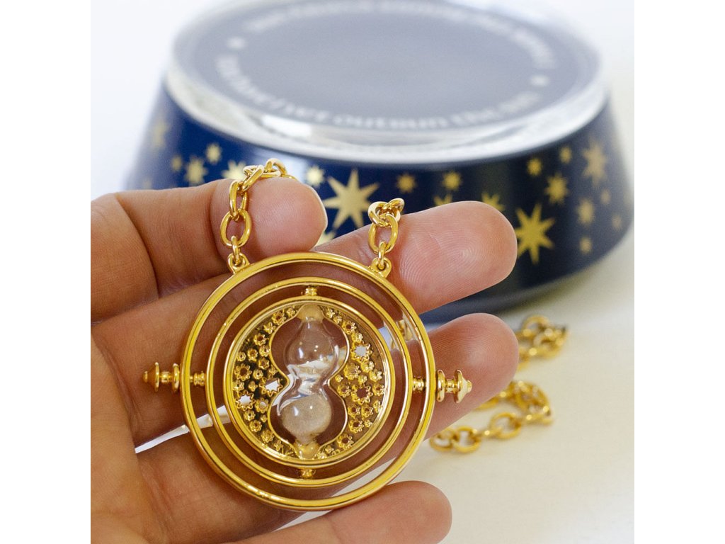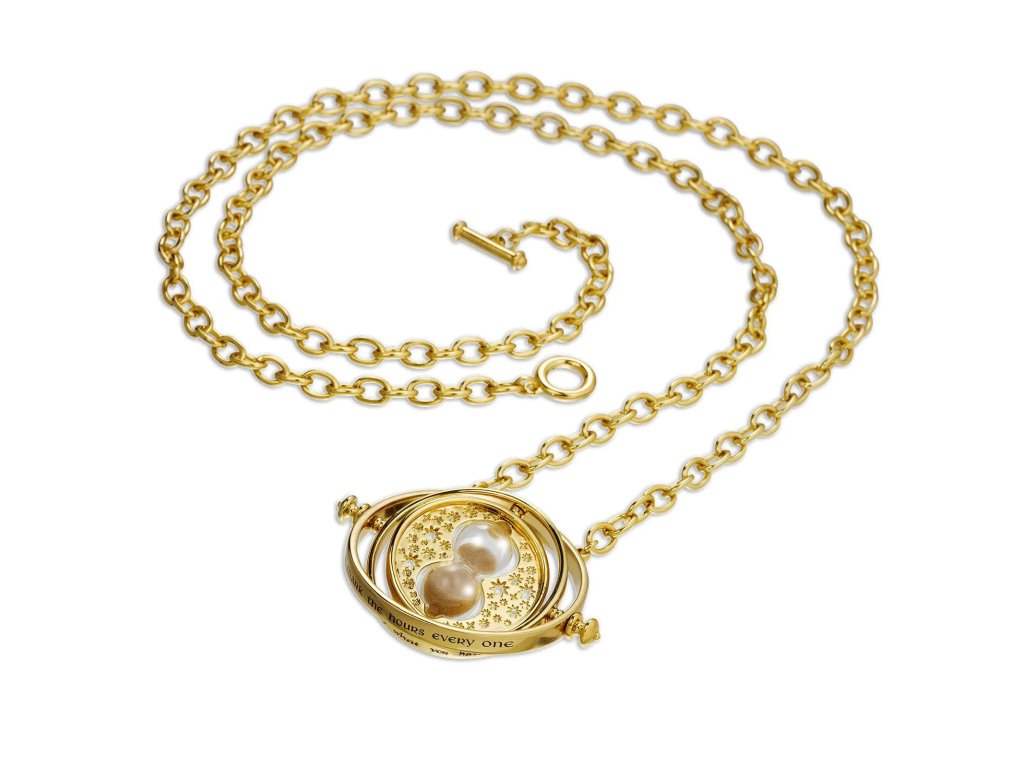 Nádherný šperk a dokonalá replika Obraceče času Hermiony Grangerové z Harry Pottera bude skvělým dárkem pro fanoušky a sběratele! Pozor, ať se nedostane do špatných rukou - velmi nebezpečný nástroj v moci mágů s nekalými úmysly! Jedná se o limitované speciální vydání v jedinečné krabičce, přívěsek je pozlacený 24 karátovým zlatem. Průměr šperku: cca 5 cm. Délka řetízku: cca 78 cm.