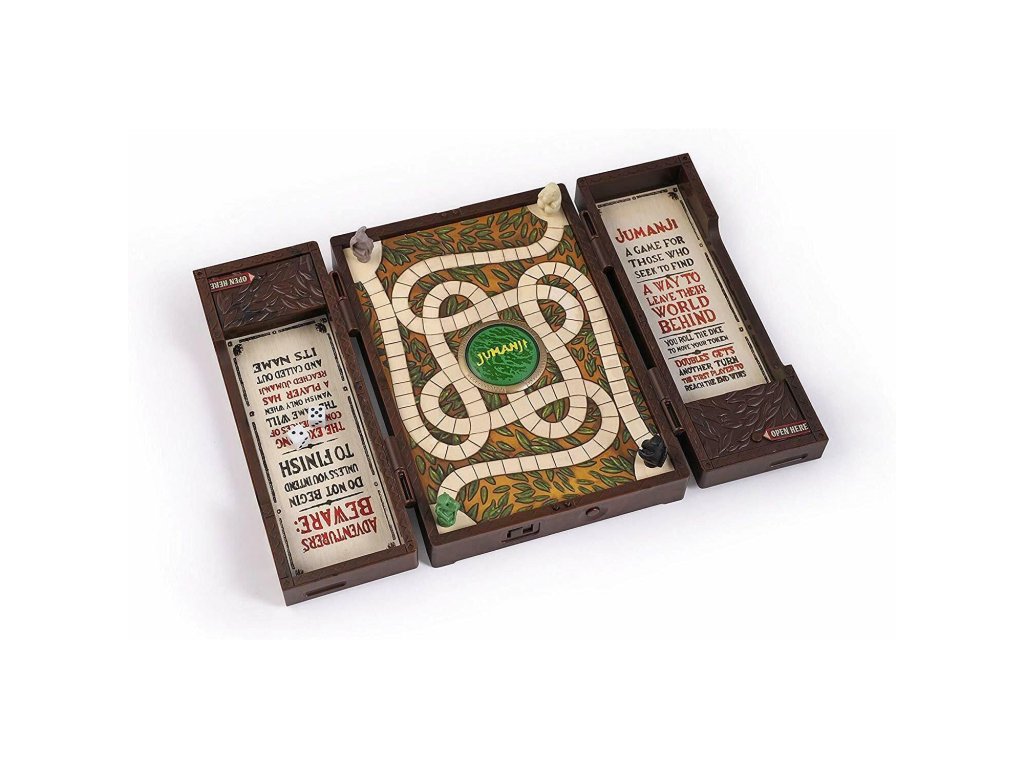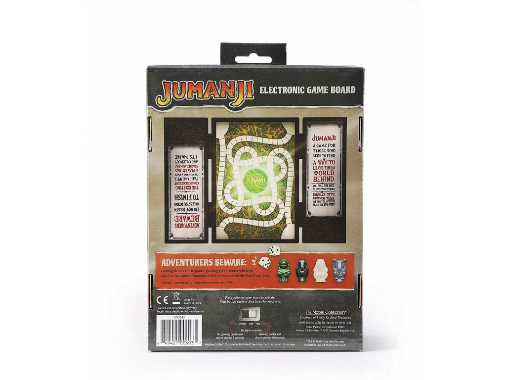 Miniaturní replika hrací desky ze slavné filmové řady Jumanji . Po rozevření desky se rozsvítí centrální logo a začnou dunět bubny. Součástí balení jsou miniaturní hrací kostky a zvířecí totemy. Rozměry rozevřené hrací desky jsou 18 x 25,5 x 1,5 cm. Napájení je třemi baterkami typu LR44 1,5V, baterky jsou součástí repliky. Poznámka: Jedná se o repliku a rekvizitu, nikoli o deskovou hru.