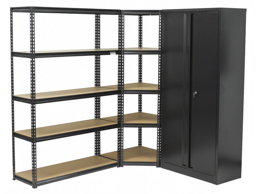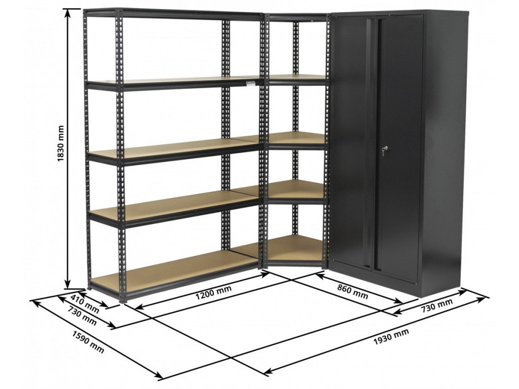 Regálový systém obsahuje klasický policový, rohový regál a dílenskou skříň. Výška 1830 mm.