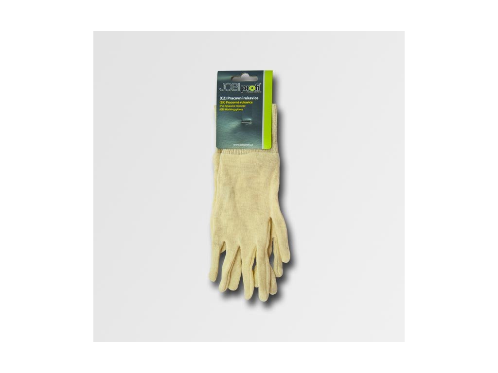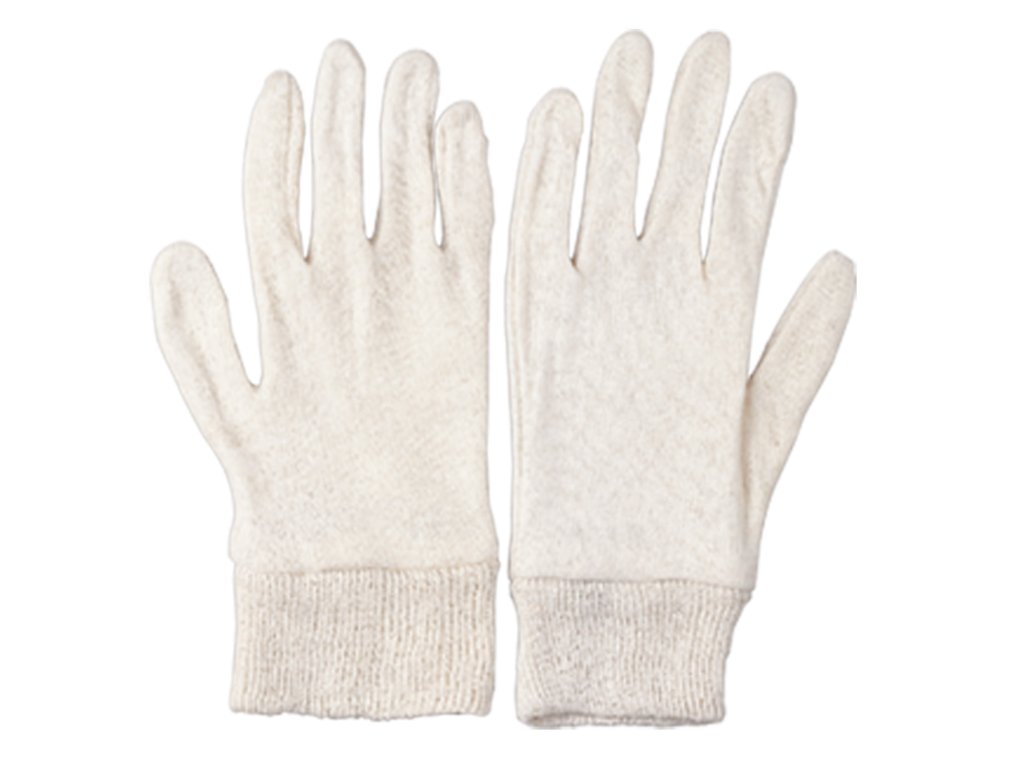 Pětiprsté rukavice šité z jemného režného bavlněného úpletu s pružným nápletem na zápěstí. velikost: univerzální