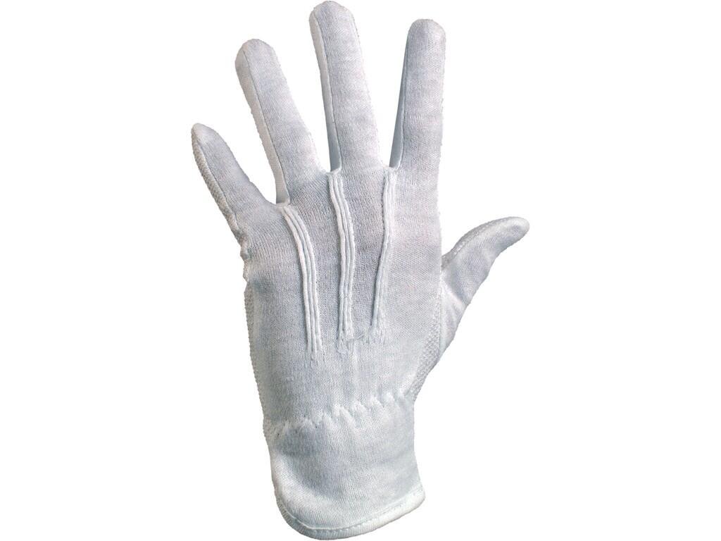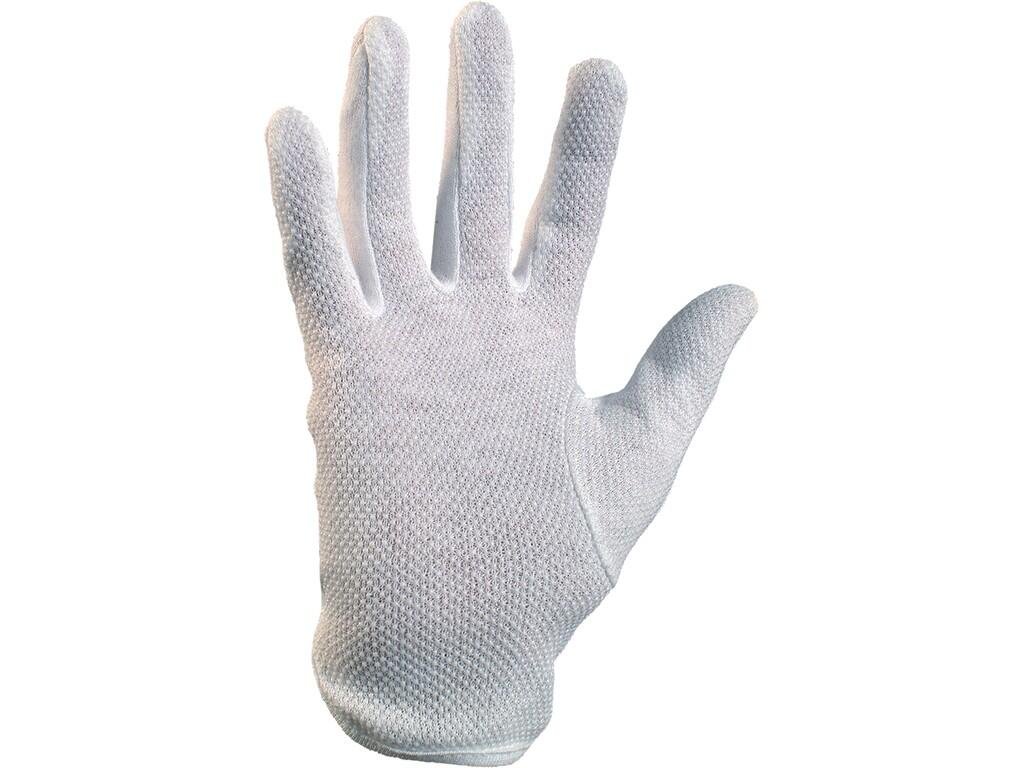 Textilní šité rukavice z běleného bavlněného úpletu, střih fourchette, dlaň a prsty pokryty drobnými PVC terčíky,