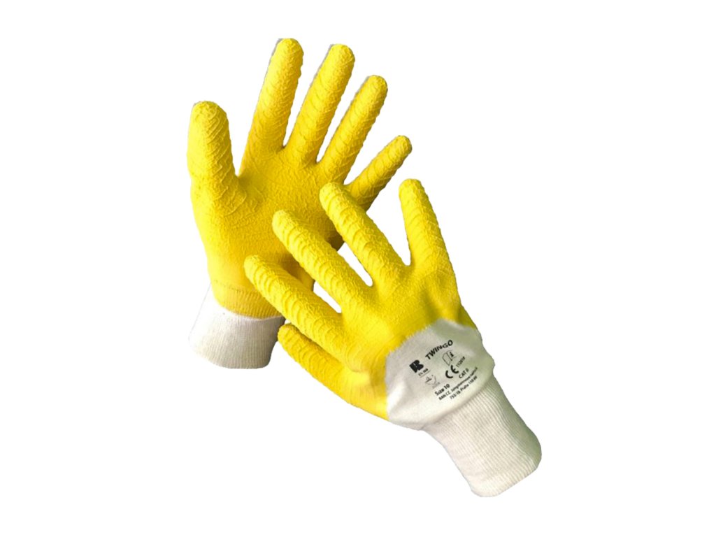 Rukavice s pružným nápletem, polomáčené v silné vrstvě žlutého latexu s protiskluznou úpravou