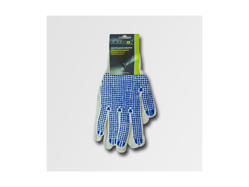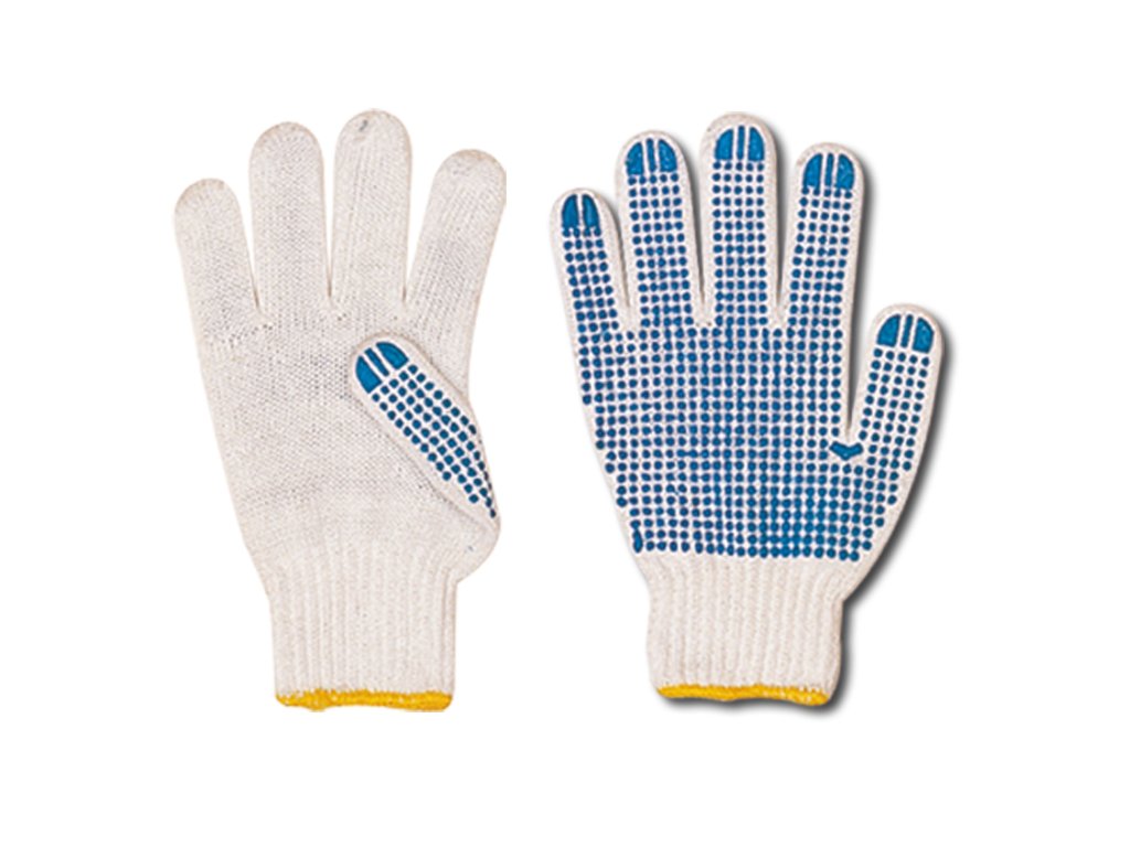 Pětiprsté rukavice Plover, pletené, polyesterové rukavice s modrými protiskluzovými terčíky PVC na dlani a prstech. Pružný náplet na zápěstí.Vhodné všeobecně pro manipulaci se suchými, neagresivními materiály.