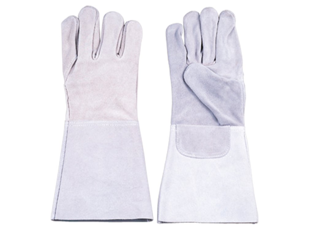 Celokožené rukavice z šedé hovězí štípenky, tuhá manžeta 15cm, bez podšívky – certifikát pro svářečské práce.