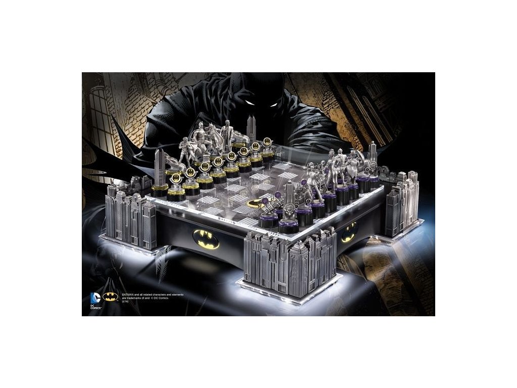 Fantastické sběratelské šachy pro fanoušky Batmana od DC Comics vás ohromí! Detailní figurky netopýřího superhrdiny a jeho přátel čelí známým padouchům města Gotham. Batmanův symbol vám posvítí na průhlednou šachovnici a vaše hra se tak stane jedinečným zážitkem. Šachy vyžadují 4 baterie AAA (nejsou součástí balení).