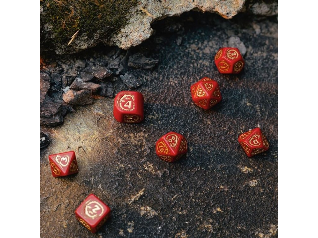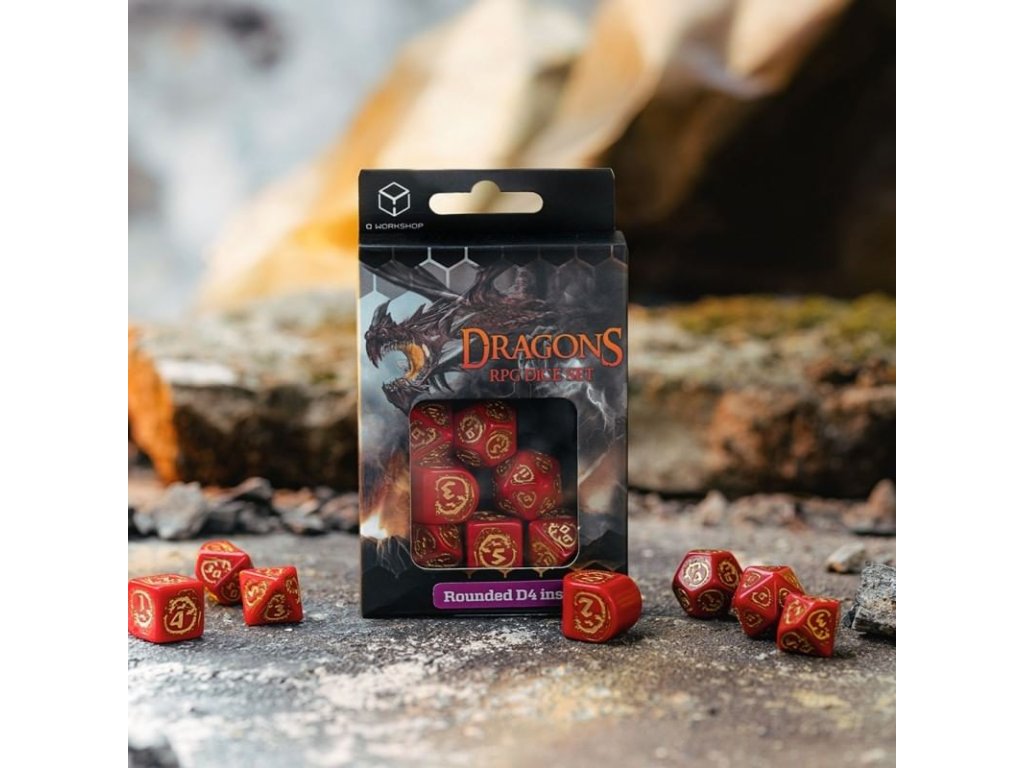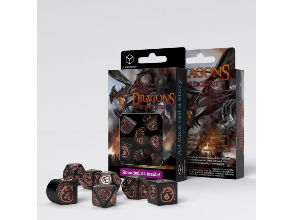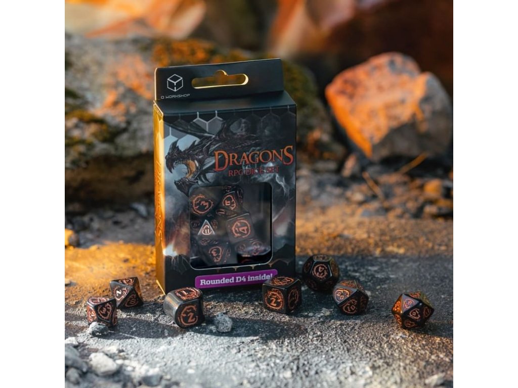 Sada obsahuje 7 mnohostěnných kostek s dračími motivy, skvělý doplněk pro hry na hrdiny a tématické deskové společenské hry. Čtyřstěnná kostka je navíc vytvořena ve zbrusu novém designu se zaoblenými hranami. Balení obsahuje čtyř, šesti, osmi, desíti, dvanácti, dvaceti stěnnou a procentovou kostku.