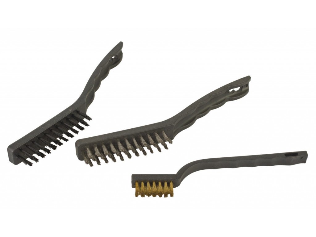 3 dílná sada drátěných kartáčů. Materiály: mosaz, ocel a nylon.