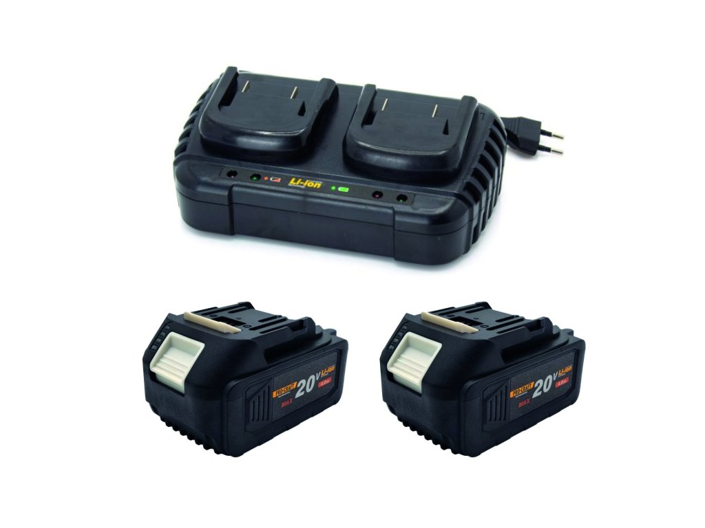 Sada obsahuje dvě baterie Procraft 20V 4Ah s ochranou proti přehřátí a vybití a nabíječku na dvě baterie s rychlým nabíjením (4Ah za 1,5 hodiny). Ideální doplněk pro nepřerušovanou práci s aku nářadím Procraft.