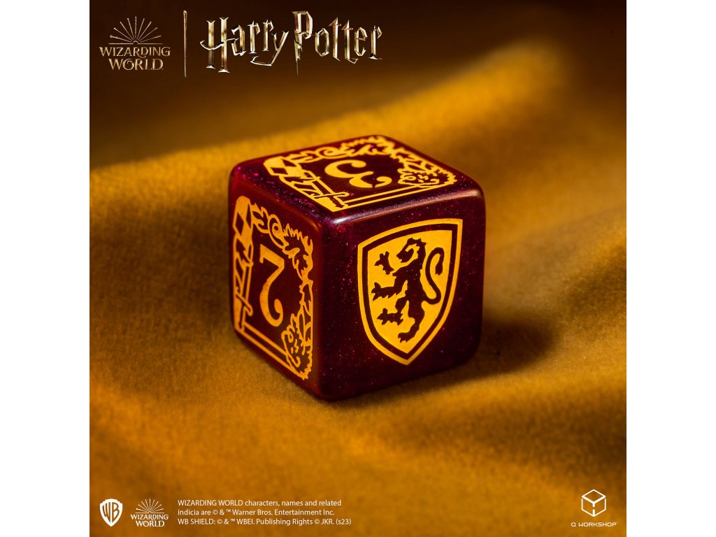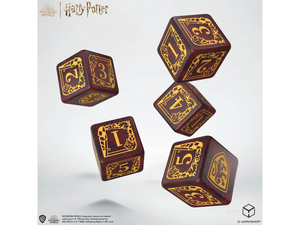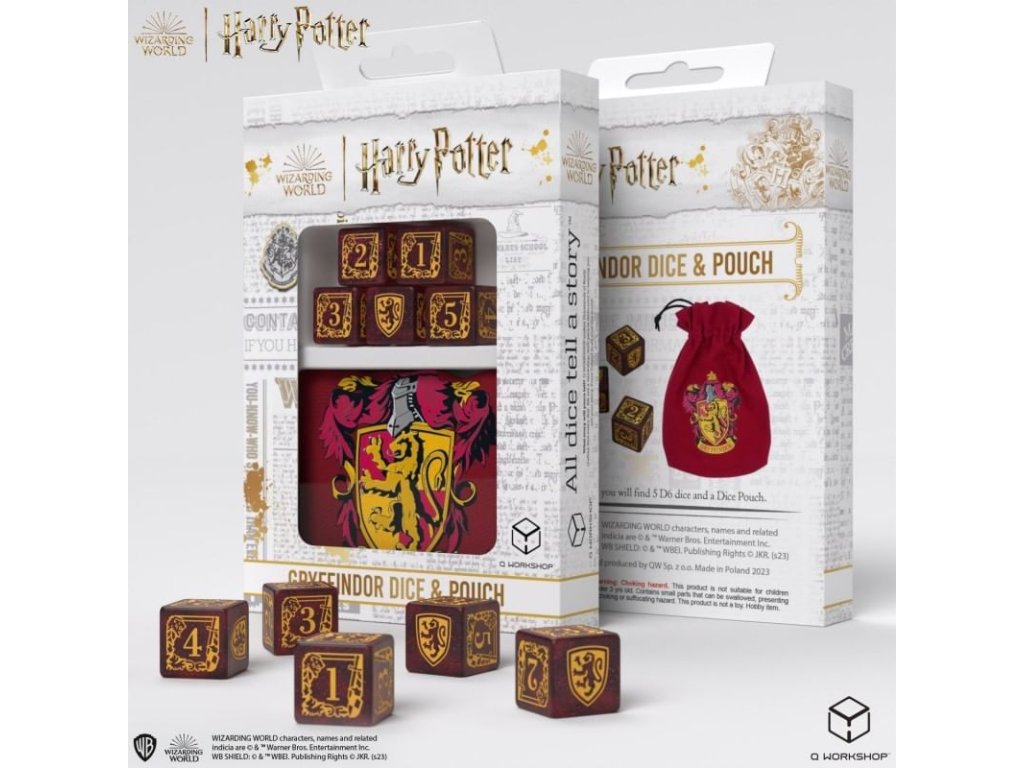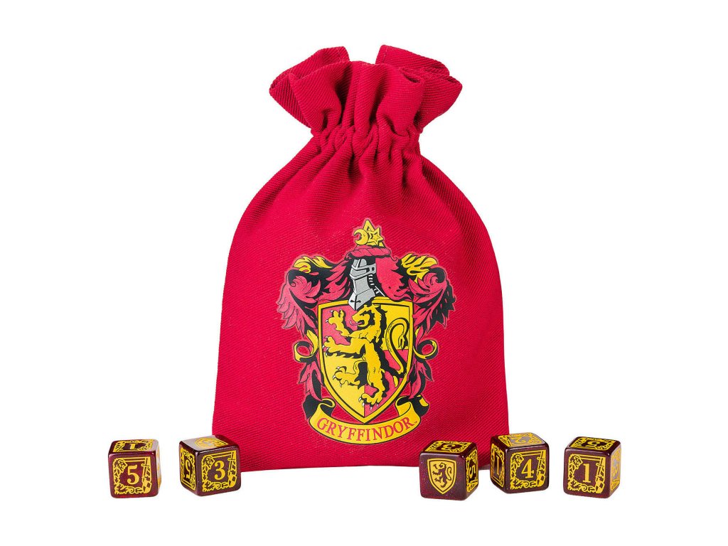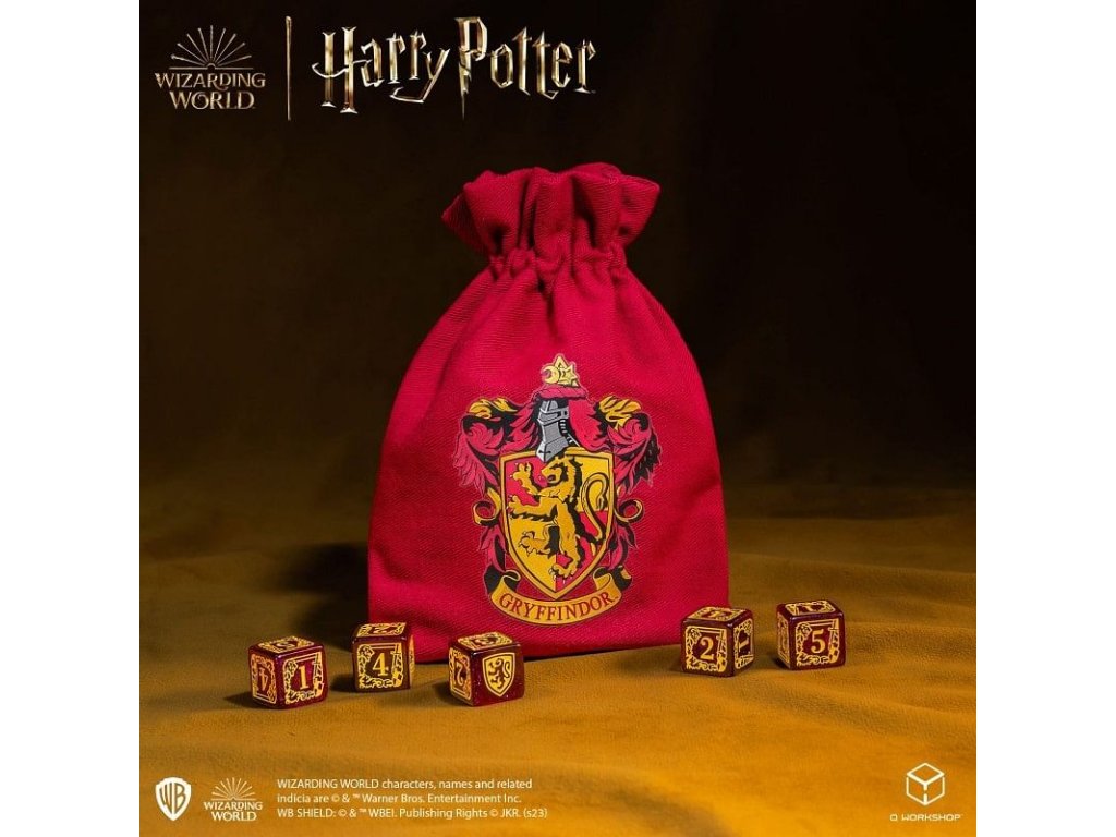 Sada obsahuje 5 šestistěnných kostek v tmavé vínové barvě s třpytkami a váček na kostky se znakem bradavické koleje Nebelvír. Místo šestky je na kostkách erb s nebelvírským lvem. Skvělý doplněk her na hrdiny a deskovek nejen ze světa Harry Pottera!