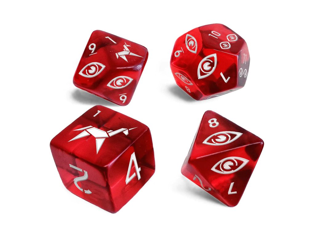 Sada kostek Blade Runner RPG obsahuje 4 čtyři červené průsvitné kostky s jedinečnými symboly pro hru na hrdiny Blade Runner RPG. Kostky vedle symbolů mají i normální číslice, takže jsou použitelné pro libovolnou hru. V sadě najdete k6, k8, k10 a k12.