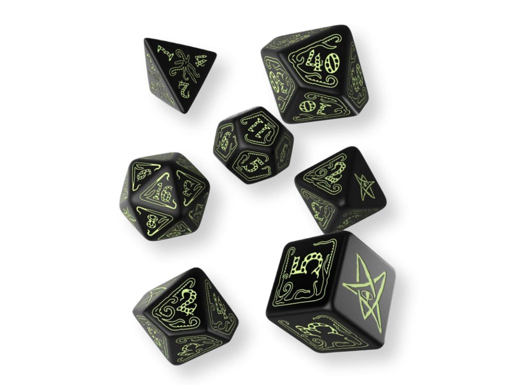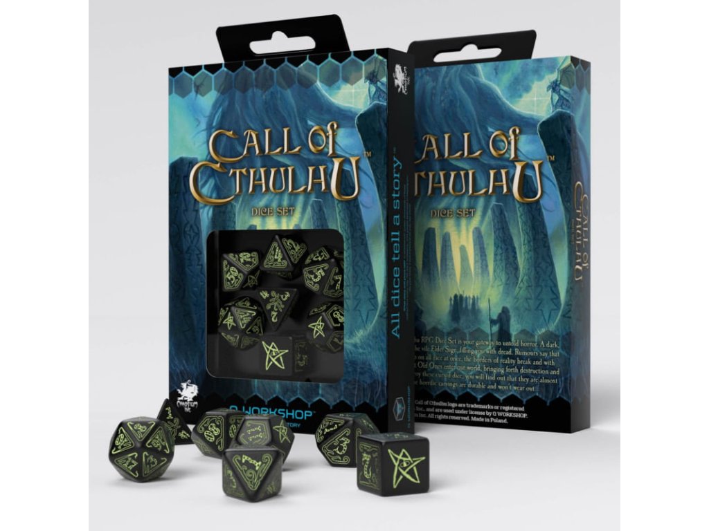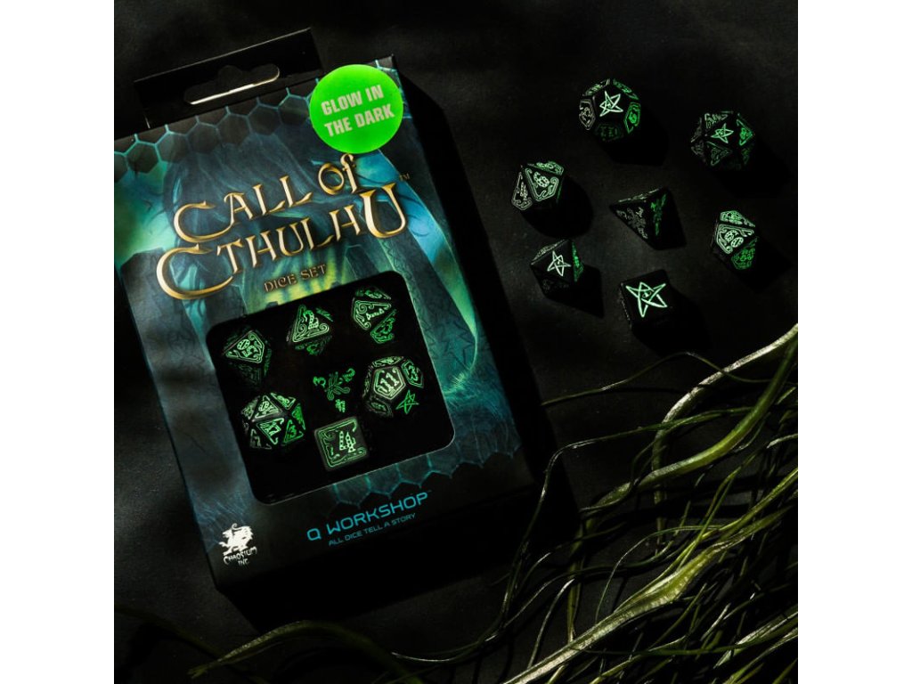 Call of Cthulhu (Volání Cthulhu) je hororové rpg, které užívá míst, nestvůr a dalších prvků povídek H. P. Lowecrafta a z děl autorů, kteří se jej později snažili napodobit. Tato sada kostek je inspirována hrou a její atmosférou, kostky jsou černé s čísly a symboly vyvedenými fluorescenční barvou - po nasvícení kostky svítí ve tmě! Sada obsahuje sedm kostek: čtyř, šesti, osmi, desíti, dvanácti, dvaceti stěnnou a procentovou kostku.