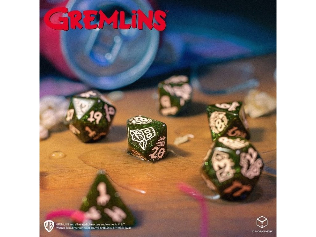 Sada obsahuje 7 mnohostěnných kostek s grafikou kultovních komediálních hororů Gremlins. Šestice kostek má třpytivě zelenou barvu a najdete na nich zlomyslné Gremliny, šestistěnka je pak třpytivě měděná a zdobí ji roztomilý Gizmo. Kostky pro vaši oblíbenou hru na hrdiny nebo deskovku! Balení obsahuje 1x čtyř, 1x šesti, 1x osmi, 1x desíti, 1x dvanácti, 1x dvaceti stěnnou a 1x procentovou kostku. Držte je dál od vody a nekrmte po půlnoci.