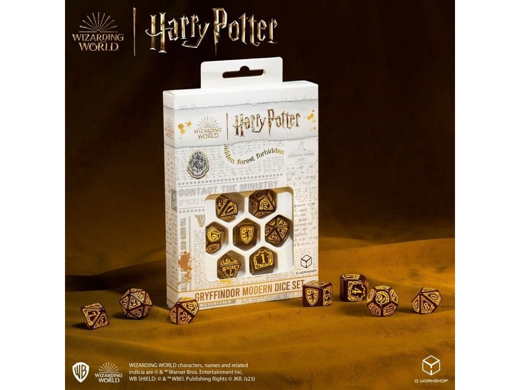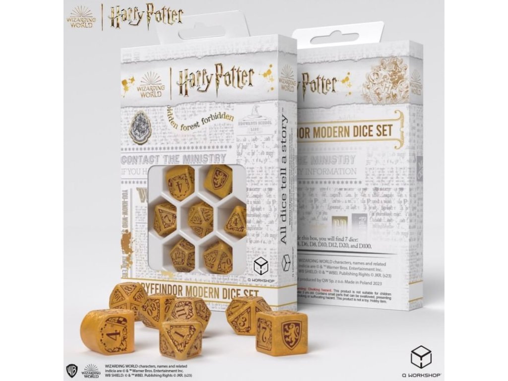Sada obsahuje 7 mnohostěnných kostek v grafice bradavické koleje Nebelvír z Harry Pottera. Originální kostky pro hry na hrdiny - nejen z magického světa J. K. Rowlingové! V nabídce máme 2 různé barevné varianty kostek: červeno-žlutou a žluto-červenou. Balení obsahuje 1x čtyř, 1x šesti, 1x osmi, 1x desíti, 1x dvanácti, 1x dvaceti stěnnou a 1x procentovou kostku.
