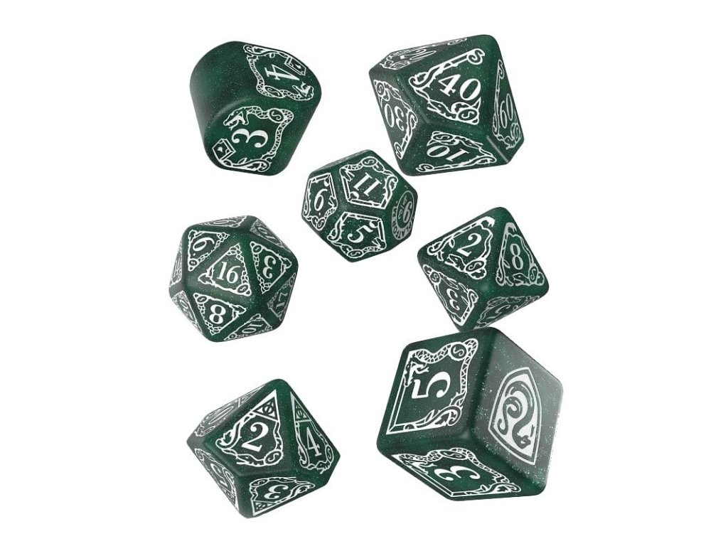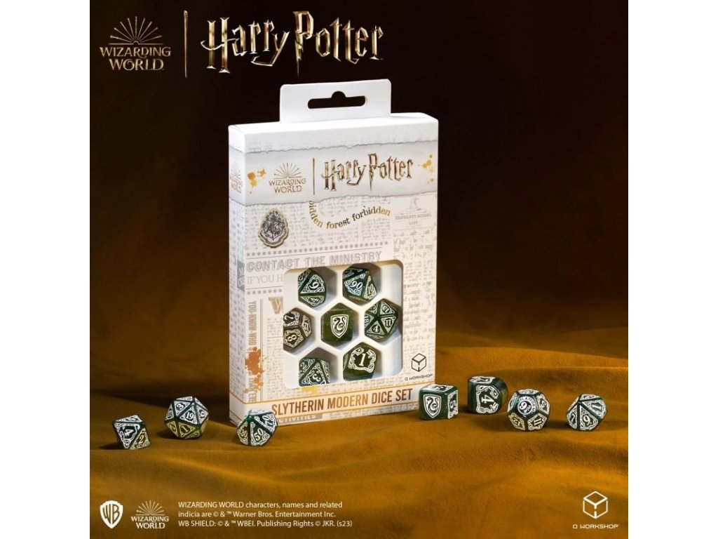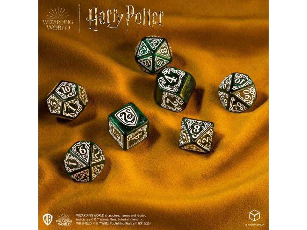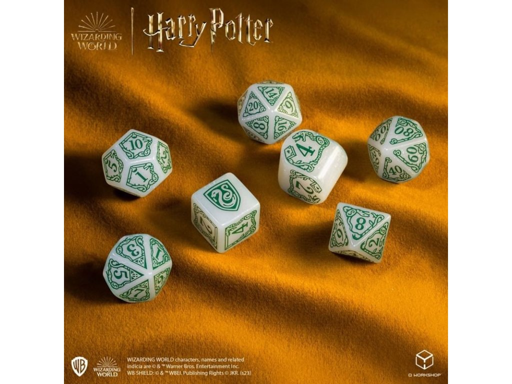 Sada obsahuje 7 mnohostěnných kostek v grafice bradavické koleje Zmijozel z Harry Pottera. Originální kostky pro hry na hrdiny - nejen z magického světa J. K. Rowlingové! V nabídce máme 2 různé barevné varianty kostek: zeleno-bílou a bílo-zelenou. Balení obsahuje 1x čtyř, 1x šesti, 1x osmi, 1x desíti, 1x dvanácti, 1x dvaceti stěnnou a 1x procentovou kostku.