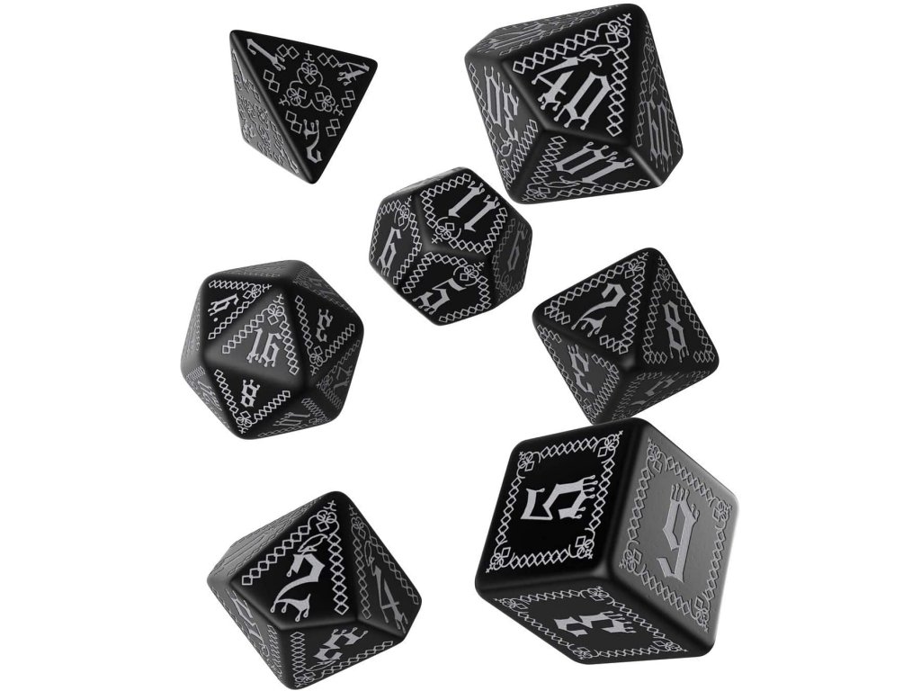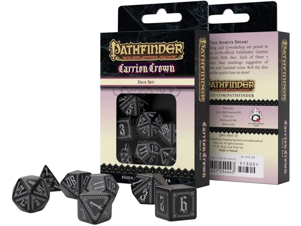 Sada sedmi precizně vyvedených kostek vyrobených na motivy dobrodružství Carrion Crown pro hru Pathfinder. Sada obsahuje: čtyř, šesti, osmi, desíti, dvanácti, dvaceti stěnnou a procentovou kostku.