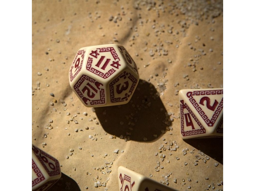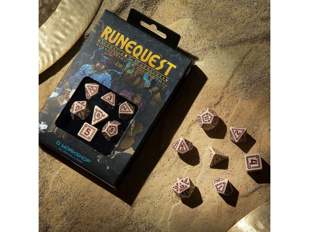 Sada obsahuje 7 různostěnných kostek pro hru na hrdiny RuneQuest v odstínu beige-burgundy. Sada obsahuje: 1x k4, 1x k6, 1x k8, 1x k10, 1x k12, 1x k20 a 1x k%.