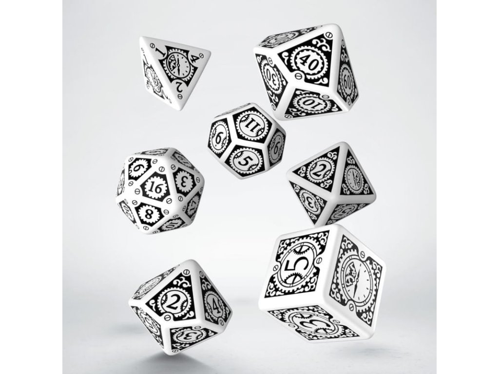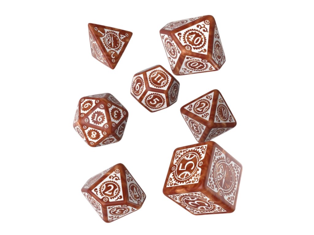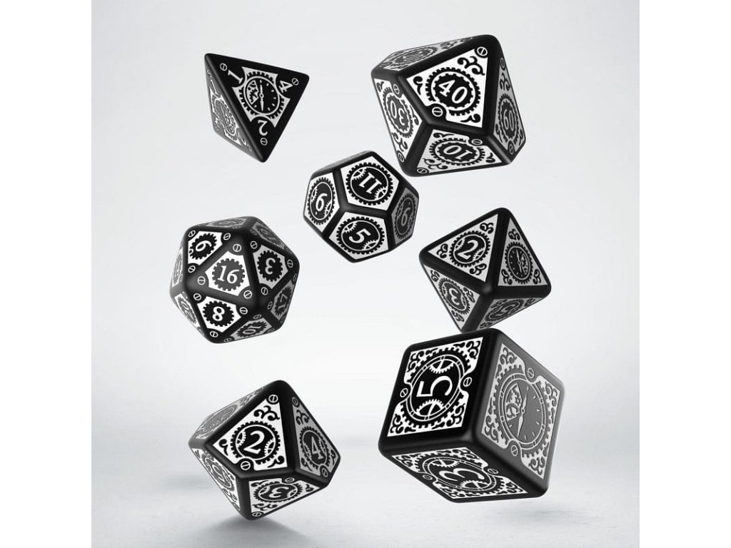 Sada obsahuje 7 mnohostěnných zdobených kostek ve stylu Steampunk Clockwork.