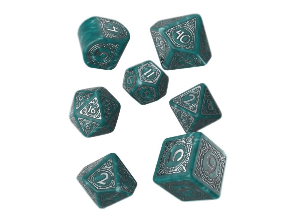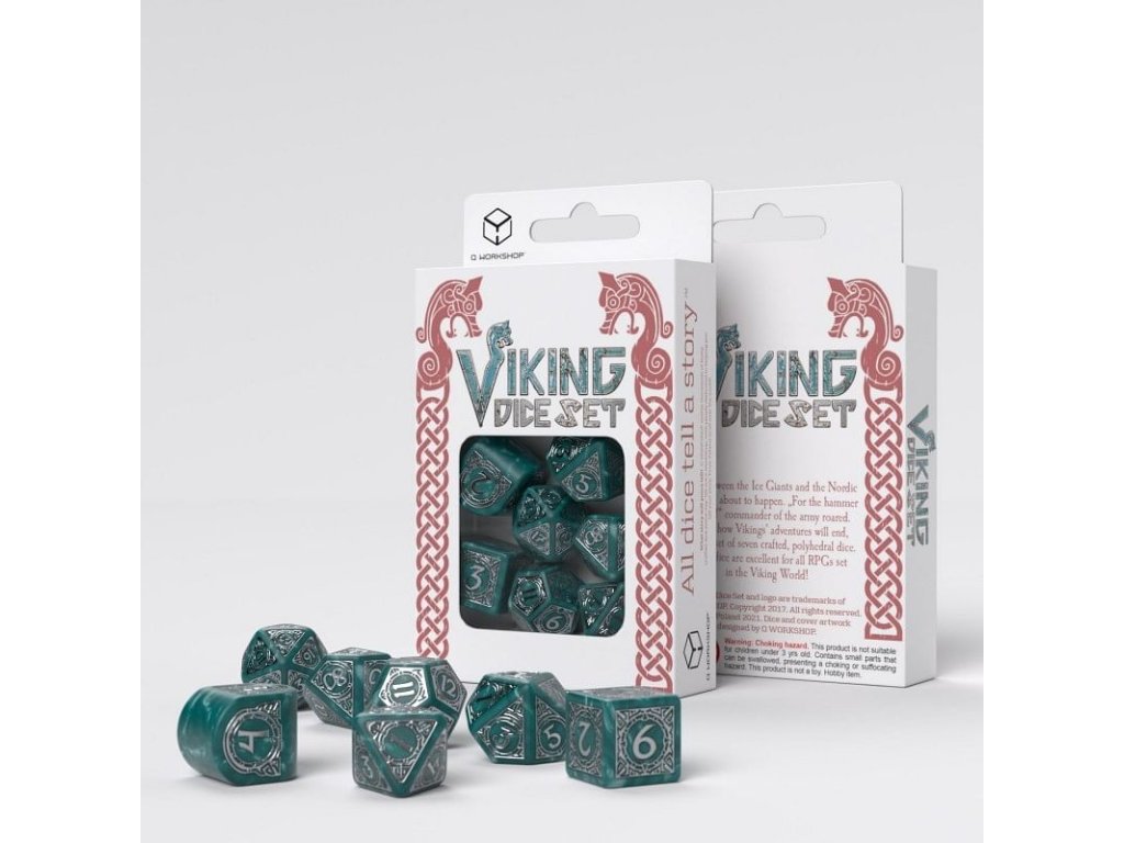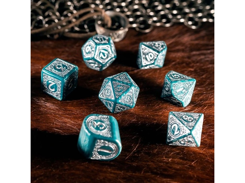 Kostky se sílou hromu! Sada kostek pro milovníky severské mytologie a Vikingů na sobě nese symboly mocného Thorova kladiva Mjolnir a runové motivy. Balení obsahuje čtyř, šesti, osmi, desíti, dvanácti, dvaceti stěnnou a procentovou kostku.