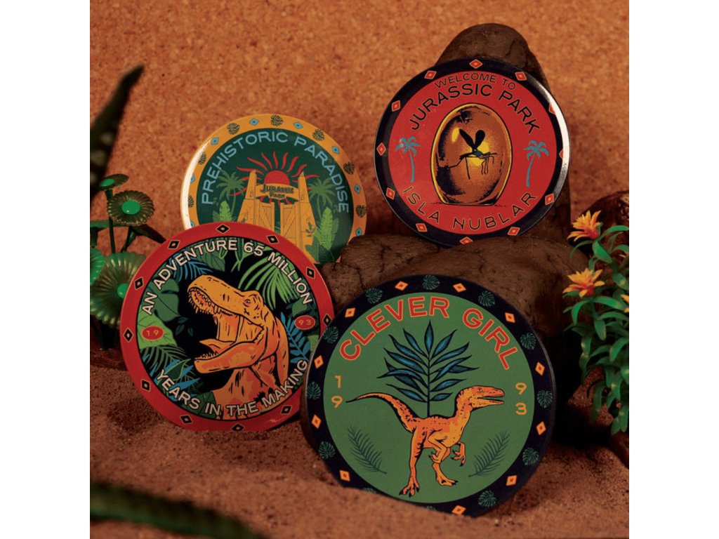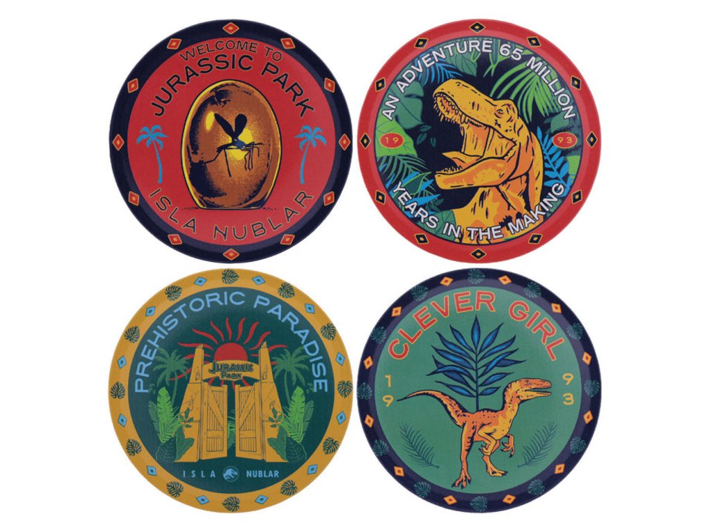 Každý podtácek se 4 tištěnými vzory s motivy dinosaurů má jedinečnou uměleckou povrchovou úpravu, včetně komára v jantaru, brány parku, raptora a T-Rexe. Tyto barevné podtácky vypadají, jako by byly zakoupeny přímo v obchodě se suvenýry parku a jsou fantastickým dárkem pro každého fanouška Jurského parku. Sada čtyř oficiálně licencovaných podtácků má průměr 89 mm a je opatřena protiskluzovou korkovou podložkou s potiskem loga Jurského parku.