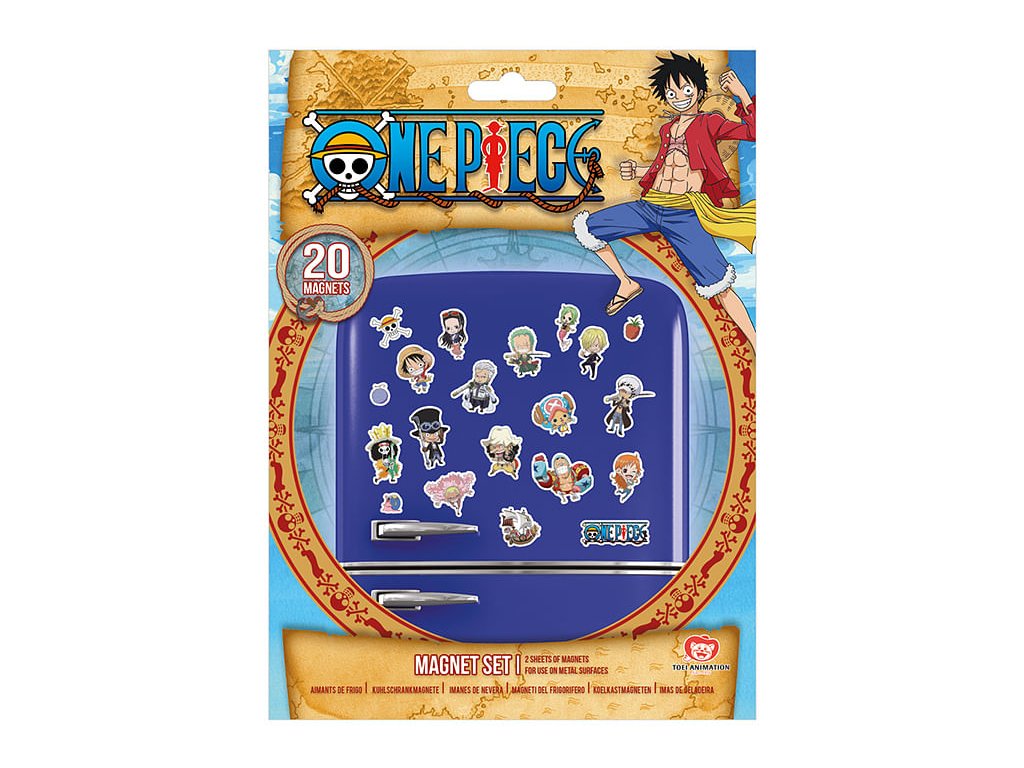 Sada obsahuje 20 magnetek ze seriálu One Piece. Ozdobte si lednici neohroženými piráty z Luffyho posádky!