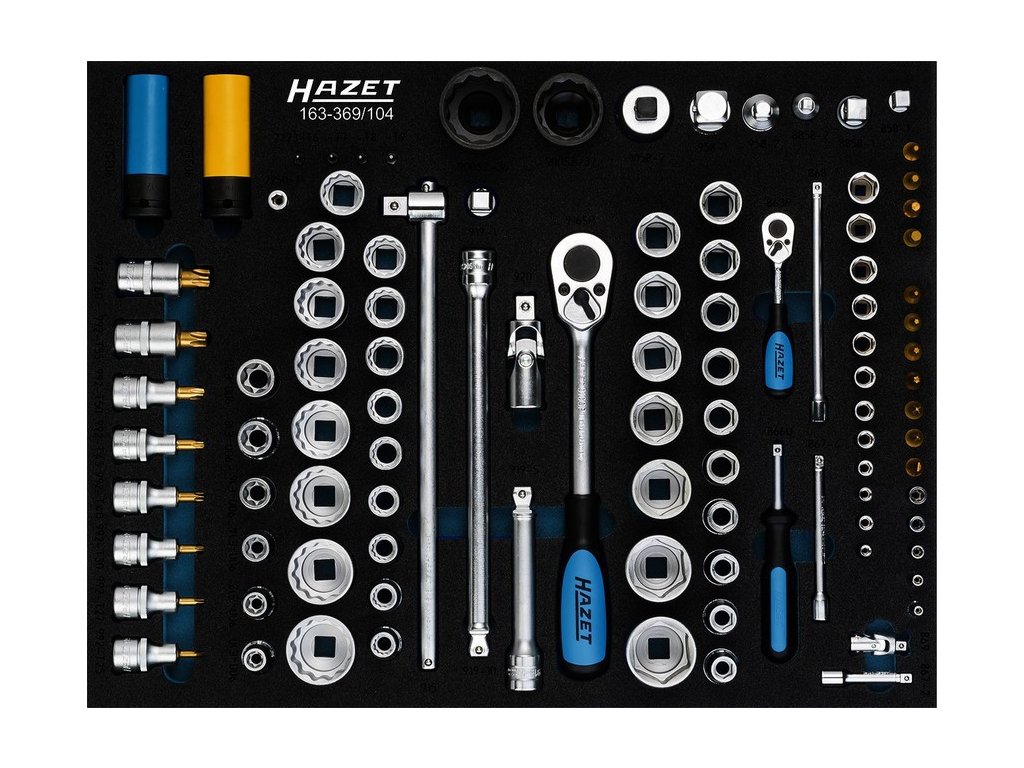 Sada nářadí, kvalitní německý výrobce HAZET, celkem 104 kusů v pěnové vložce, vhodná pro dílenské vozíky HAZET, obsahuje mj. gola sadu a hlavice s bity.