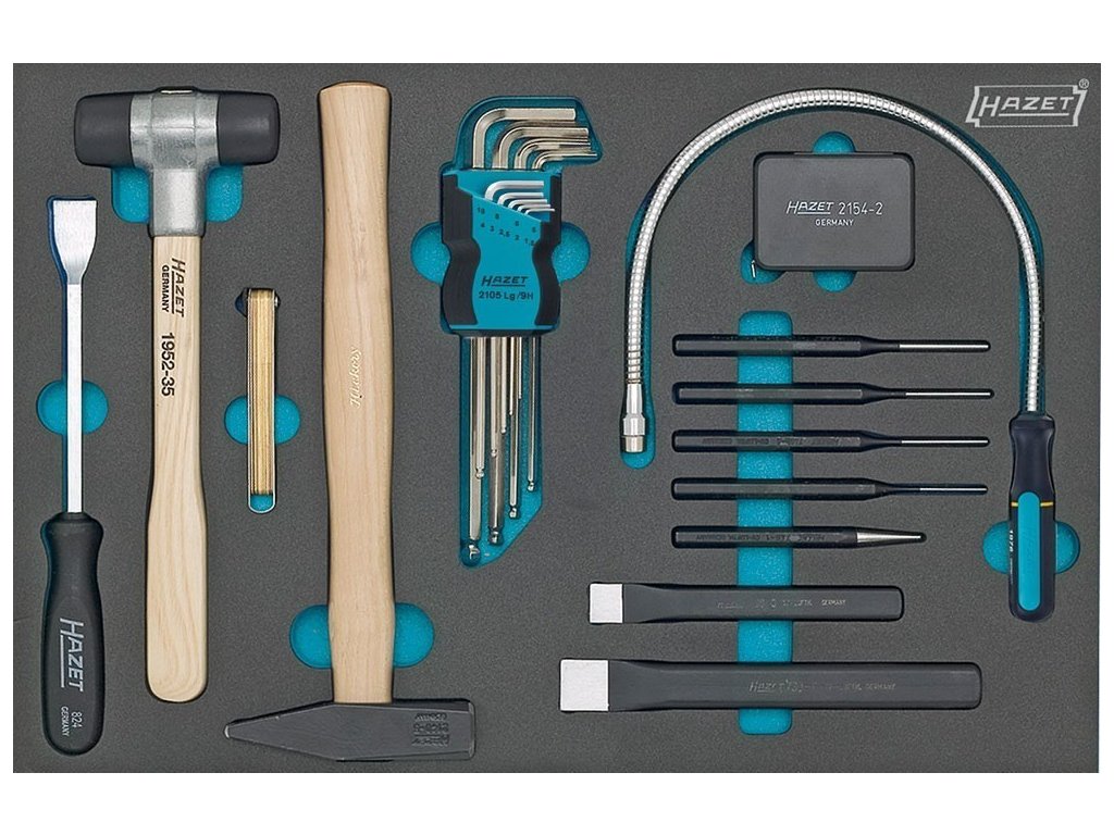 Sada kvalitního německého nářadí HAZET, 22 kusů v pěnové vložce, ideální do pojízdných vozíků, obsahuje kladivo a palici, sadu vyražečů a další nářadí.