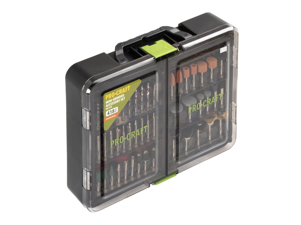 Univerzální sada nástavců Procraft GK-418 (418 ks) pro přímé brusky. Obsahuje nástroje pro broušení, řezání, leštění, vrtání a další aplikace. Ideální pro práci s kovem, dřevem, plastem, sklem a keramikou. Vhodná pro profesionální i hobby použití.