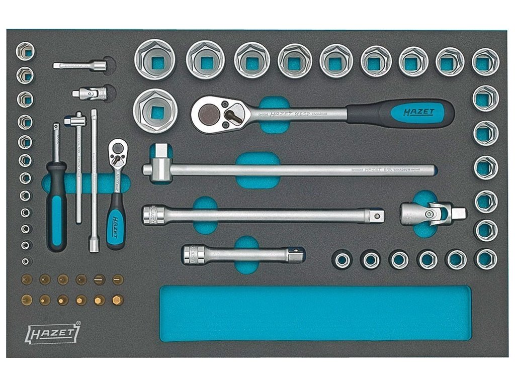 Sada kvalitních nástrčných klíčů HAZET, 56 kusů v pěnové vložce, obsahuje ráčny, adaptéry a ořechy 1/4" a 1/2" spolu se sadou bitů.