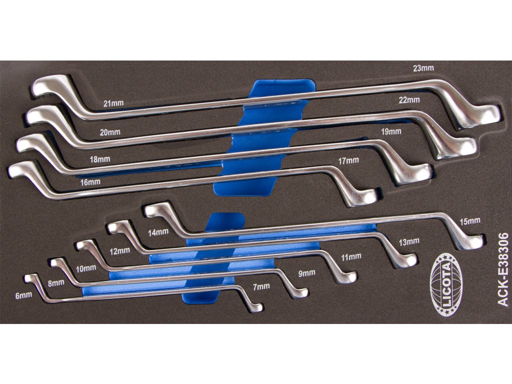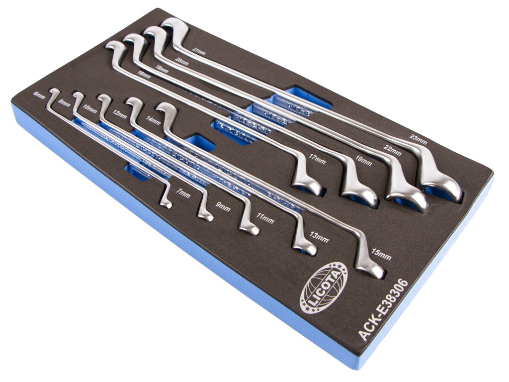 Sada oboustranných očkových klíčů v pěnové výplni do zásuvek vozíků a skříněk, 9 kusů, vyhnuté o 75°, značka LICOTA, velikost 6x7 až 21x23 mm.