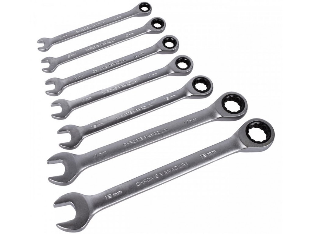 Sada sedmi očkoplochých ráčnových klíčů ve velikostech 8, 9, 10, 11, 13, 17 a 19 mm. Délka těchto klíčů je od 140 do 245 mm. Vyrobeny jsou z Cr-V oceli a jsou pochromované.