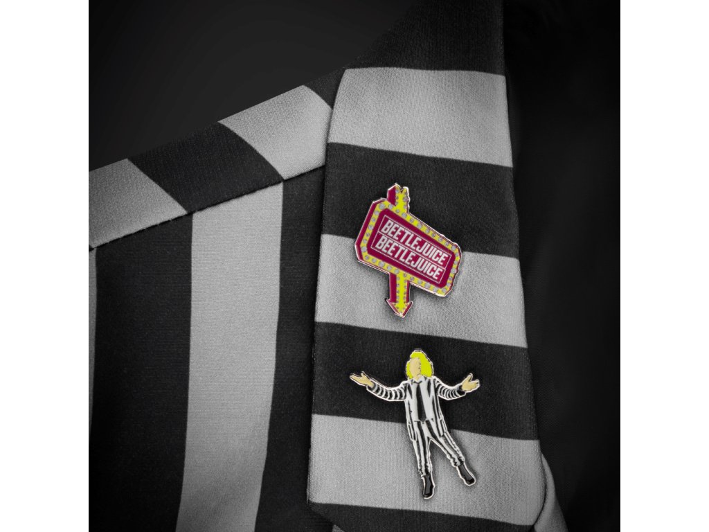Odhal fantaskní říši posmrtného života na stříbrném plátně s odznaky Beetlejuice. Tyto odznáčky jsou strašidelné a mají špetku černého humoru, a proto se skvěle hodí k decentnímu doplnění tvého outfitu. Na jednom odznaku je vyobrazen Beetlejuice v jeho ikonickém, pruhovaném obleku a nezapomenutelnou osobností. Na druhém je vyobrazena neonová tabule s jeho jménem.