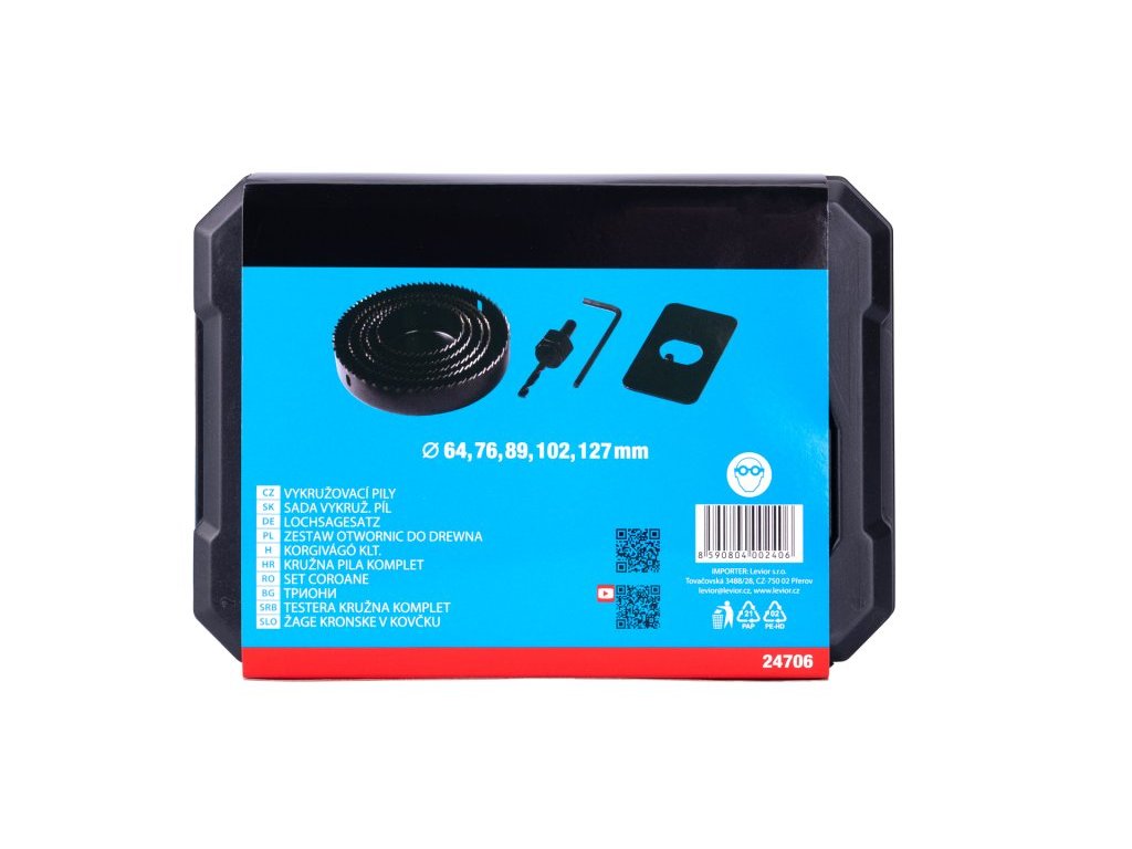 Sada vykružovacích pil 8ks do dřeva a sádrokartonu, průměr: 64,76,89,102,127 mm, inbus+hlavička.